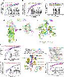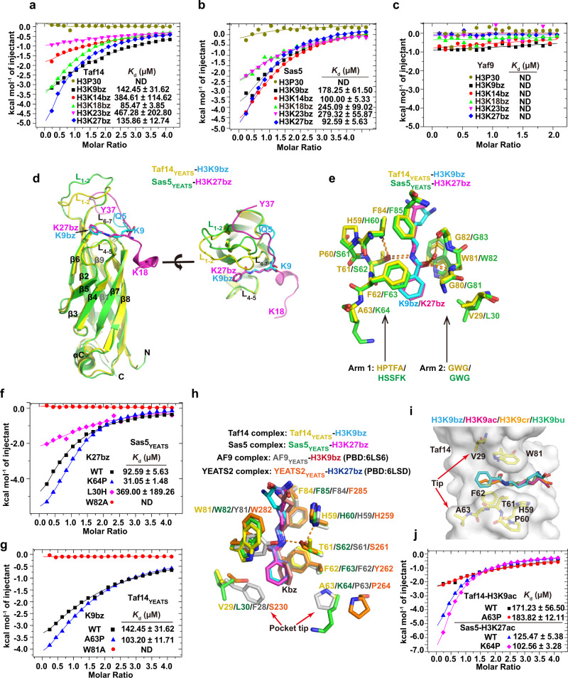 Fig. 5. YEATS domains from Taf14 and Sas5 are Kbz readers.a ITC analyses show that Taf14YEATS has different binding affinities with Kbz peptides. b ITC analyses show that Sas5YEATS could bind Kbz peptides with different binding affinities. c ITC analyses show that Yaf9YEATS does not bind any Kbz peptides tested or that the binding affinity is beyond the detection limit. d Superimposition of Taf14YEATS-H3K9bz and Sas5YEATS-H3K27bz structures. The Taf14YEATS and Sas5YEATS are shown in yellow and green; H3K9bz and H3K27bz peptides are shown in blue and magenta. e The benzoyl groups in H3K9bz and H3K27bz peptides are inserted into a conserved binding pocket sharing nearly identical interacting networks. The residues involved in hydrophobic contacts and hydrogen bonds (orange dashed lines) are localized in two arms, embracing the benzoyl group. The red dot is the water molecule. f ITC results show the effects of Sas5YEATS mutations on the interaction between Sas5YEATS and H3K27bz peptide. g ITC results show the effects of Taf14YEATS mutations on the interaction between Taf14YEATS and H3K9bz peptide. h Superimposition of four YEATS-Kbz complex structures, including AF9-H3K9bz (gray-red), YEATS2-H3K27bz (orange-navy blue), Taf14-H3K9bz (yellow-cyan), and Sas5-H3K27bz (green-magenta). The residues at the tip regions of the benzoyl-binding pocket are different and indicated by arrows. i The acyl-binding pocket of Taf14YEATS. Four Taf14YEATS structures are superimposed, including Taf14-H3K9bz, Taf14-H3K9ac (PDB: 5D7E), Taf14-H3K9cr (PDB: 5IOK), and Taf14-H3K9bu (PDB: 6MIQ). The benzoyl, acetyl, crotonyl, and butyryl groups are shown in cyan, magenta, orange, and green, respectively. The tip residues of V29 and A63 are involved in the fine-tuning of pocket shapes to accommodate different acylation marks. j ITC results reveal that the mutations of tip residues on Taf14YEAST and Sas5YEATS have negligible effects on binding with acetylated peptides. |
