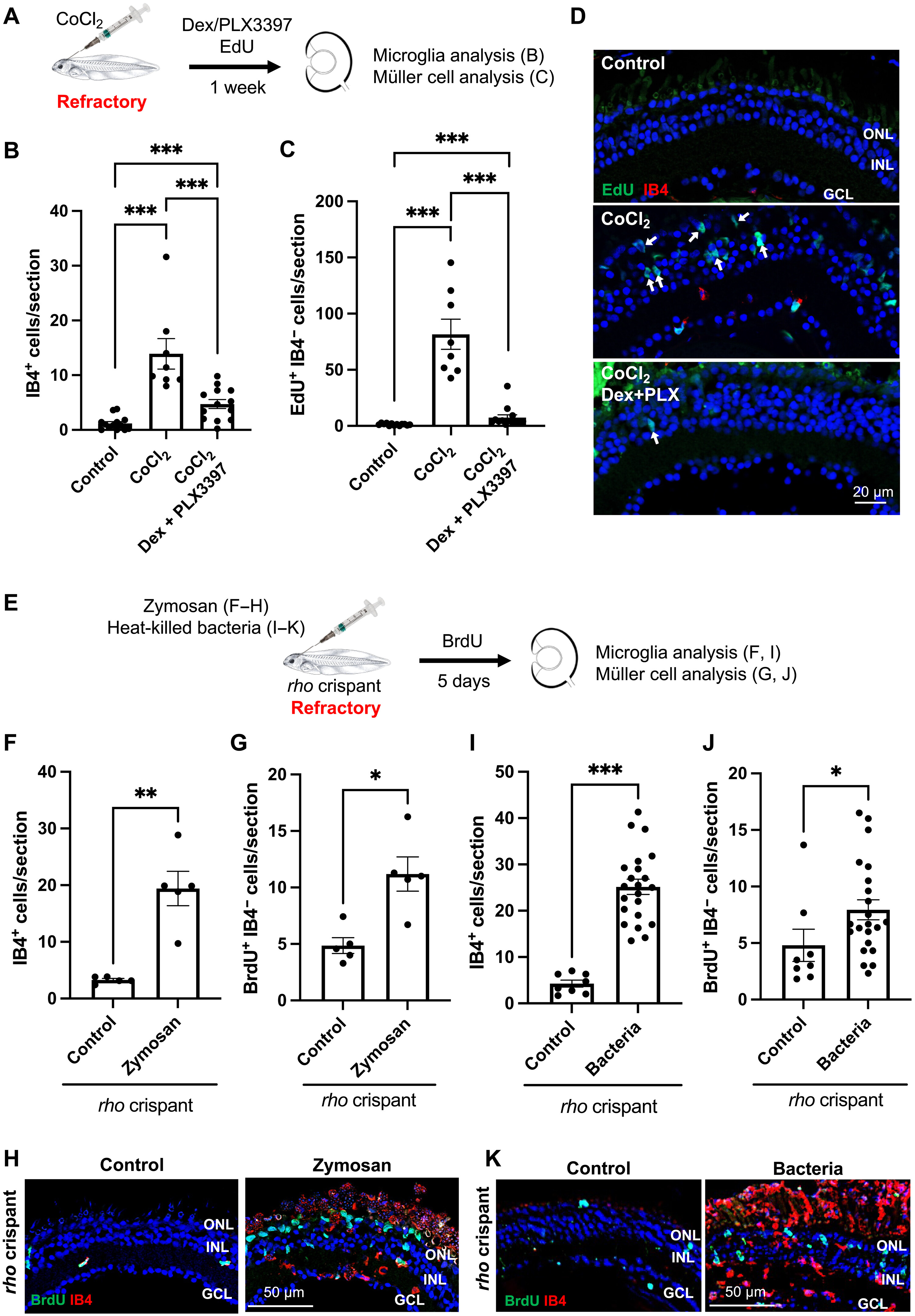 Fig. 4. Neuroinflammation triggers Xenopus Müller cells to exit quiescence upon degeneration at a refractory stage. (A) Procedure used in (B) to (D). Tadpoles at a refractory stage were intraocularly injected with 25 mM CoCl2, soaked for 1 week in PLX3397 plus Dex solution, exposed to EdU for the last 3 days and then processed for immunolabeling on retinal sections. (B to D) Quantification of IB4-positive cells [microglia (B)] and EdU-positive, IB4-negative cells [proliferative Müller glia (C)] on retinal sections. Shown in (D) are representative images of retinal sections. Arrows point to EdU-positive/IB4-negative cells in the INL and ONL. (E) Procedure used in (F) to (K). rho crispant tadpoles at a refractory stage were intraocularly injected with zymosan [(F) to (H)] or heat-killed bacteria [(I) to (K)], exposed to BrdU solution for 5 days, and then processed for immunolabeling on retinal sections. (F to K) Quantification of IB4-positive cells [microglia (F) and (I)] and BrdU-positive, IB4-negative cells [proliferative Müller glia (G) and (J)]. Shown in (H) and (K) are representative images of retinal sections. Nuclei are counterstained with Hoechst. Data are represented as means ± SEM, and each point represents one retina. *P < 0.05; **P < 0.01; ***P < 0.001 (Mann-Whitney test). GCL, ganglion cell layer; INL, inner nuclear layer; ONL, outer nuclear layer. |