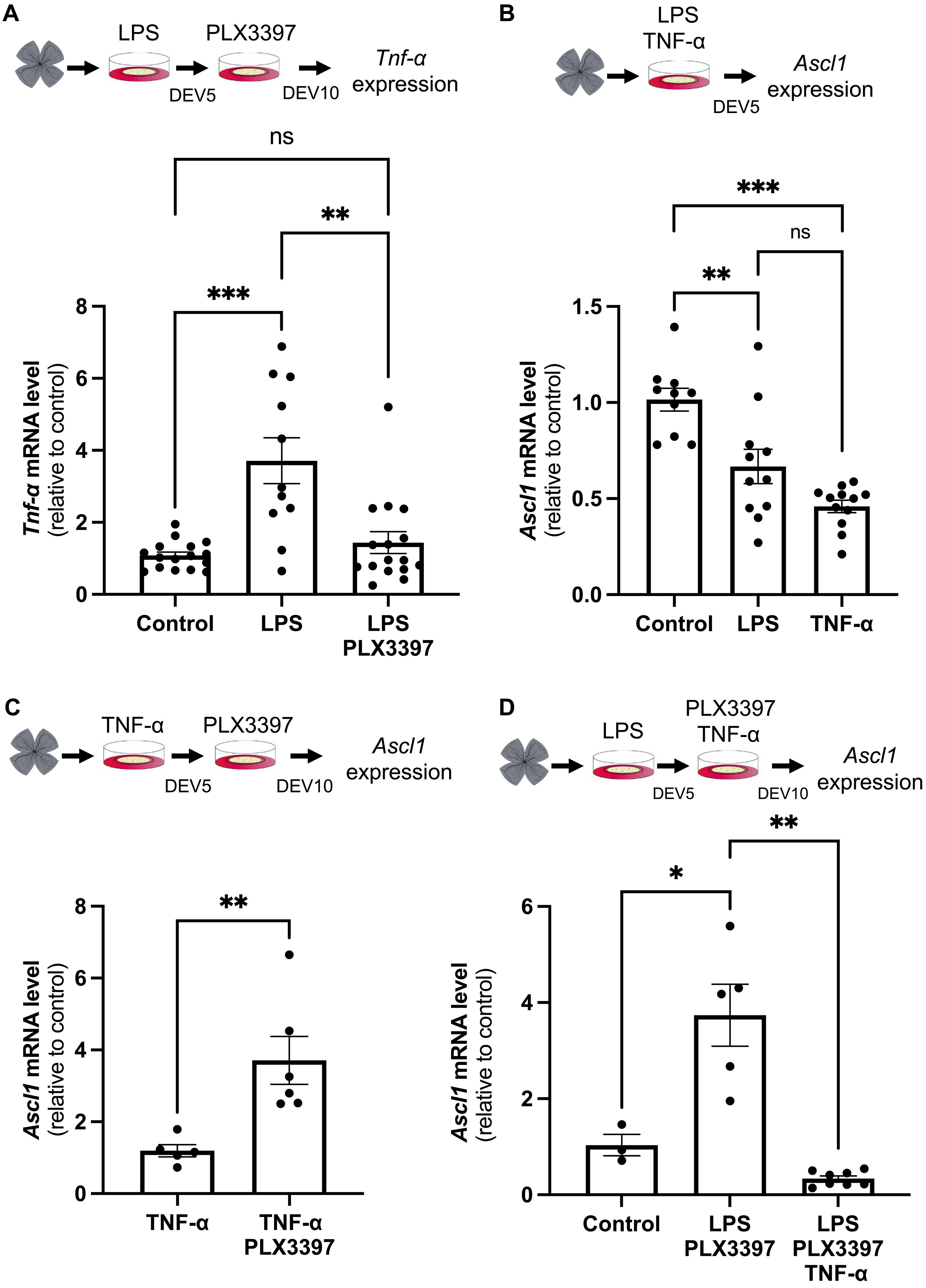 Fig. 9. TNF-α is detrimental to the neurogenic potential of Müller cells. (A) Retinas from wild-type mice were flattened and cultured for 5 days in the presence of LPS and then cultured for an additional 5 days in the presence of PLX3397. Other batches of explants were also cultured for 10 days but were either untreated (control) or only treated with LPS for the first 5 days. Retinal explants were processed for qPCR analysis of Tnf-α expression at DEV10. (B) Retinas from wild-type mice were flattened and cultured for 5 days in the presence of LPS or TNF-α. Retinal explants were processed for qPCR analysis of Ascl1 expression at DEV5. (C) Retinas from wild-type mice were flattened and cultured for 5 days in the presence of TNF-α and then cultured for 5 days with or without PLX3397. Retinal explants were processed for qPCR analysis of Ascl1 expression at DEV10. (D) Retinas from wild-type mice were flattened and cultured for 5 days in the presence of LPS and then cultured for 5 days in the presence of PLX3397 or PLX3397 plus TNF-α. Retinal explants were processed for qPCR analysis of Ascl1 expression at DEV10. Data are represented as means ± SEM, and each point represents one retinal explant. ns, not significant; *P < 0.05; **P < 0.01; ***P < 0.001 (Mann-Whitney test). Created using BioRender.com. |