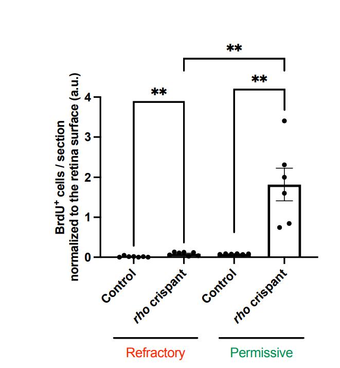 Figure S1. The response of Müller cells to injury varies along with aging in Xenopus tadpoles. Quantification of BrdU-positive cells (3-day exposure) in retinal sections of young (refractory) or old (permissive) control and rho crispant tadpoles. Data were normalized to the entire surface of the retinal section and are represented as mean ± SEM. Each point represents one retina. **p < 0.01 (Mann-Whitney test). |