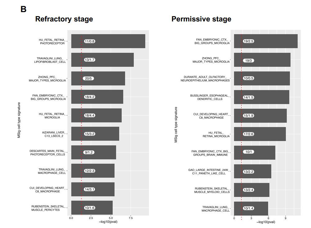 Figure S3. Differential gene expression at refractory and permissive stages. (A) Volcano plot representing differentially expressed genes at refractory and permissive stages. 456 and 272 genes are statistically differentially expressed (|LFC| >1, padj <0.05) at refractory and permissive stages, respectively. Arrows point to rho genes targeted by CRISPR/Cas9. (B) Enriched cell-type molecular signature identified based on the differentially expressed genes (|LFC| >1 and padj <0.05). Numbers in bars represent observed/expected genes. |