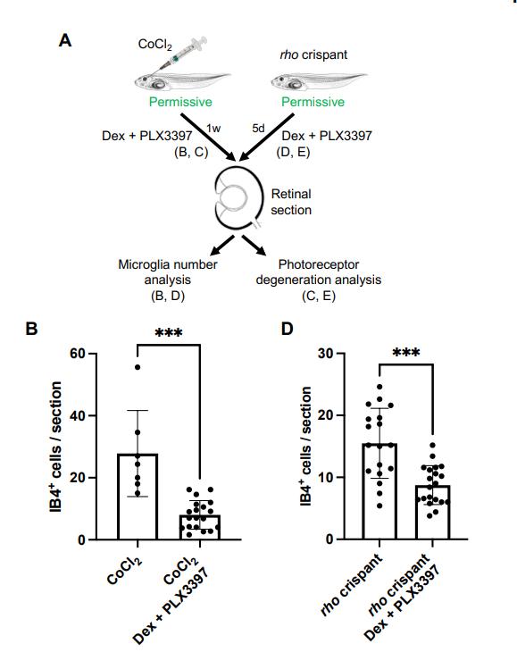 Figure S5. Dex plus PLX3397 treatment efficiently decreases the number of microglial cells in CoCl2- injected or rho crispant tadpoles, without impacting retinal degeneration. (A) Outline of the experimental procedure used in (B-E). Stage 56/62 (permissive stage) CoCl2-injected (B, C) or rho crispant (D, E) tadpoles were soaked in PLX3397 plus Dex solution for 5 days (5d) or 1 week (1w) as indicated, starting one day before CoCl2 injection. They were then processed for immunolabeling on retinal sections. (B, D) Quantification of IB4-positive cells (microglia). (C, E) Representative images of retinal sections labeled for Opsins (cones) and/or Rhodopsin (rods). Nuclei are counterstained with Hoechst. Data are represented as mean ± SEM, and each point represents one retina. ***P < 0.001 (Mann-Whitney test). GCL, ganglion cell layer; INL, inner nuclear layer; ONL, outer nuclear layer. |