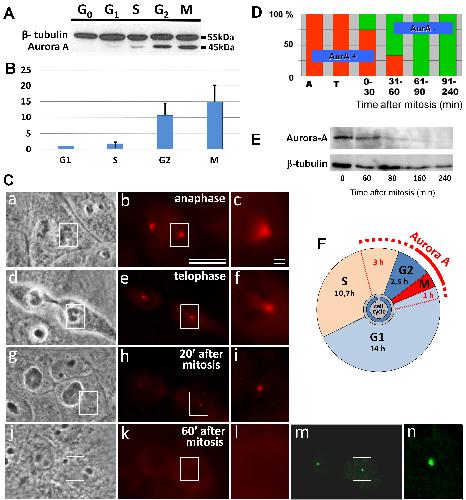 Disappearance of Aurora A from the centrosome region in XL2 cells. (A) Analysis of relative Aurora A quantity in different phases of the cell cycle. Western blot analysis of cell fractions enriched by G0, G1, S, G2-phases, and mitosis (M). (B) Comparative quantitative analysis of Aurora A in different cell cycle phases from Western blot (ratio Aurora A to beta-tubulin in G1 was considered as 1). (C) Phase contract (a,d,g,j) and Aurora A (red) immunofluorescent labeling (b,c,e,f,h,i,k,l), or gamma-tubulin (green) immunofluorescent labeling (m,n). Images c, f, i, l, and n show the enlarged centrosome region from images b, e, h, k and m, respectively. Bars: 10 µm (a,b,d,e,g,h,j,k,m) and 1 µm (c,f,i,l,n). (D) Diagram of the ratio Aurora A-positive and Aurora A-negative centrosomes from immunofluorescent data of XL2 cells in A—anaphase, T—telophase of mitosis, and post-mitotic cells. (E) Analysis of Aurora A degradation after mitosis. Cells were synchronized in mitosis, and the level of Aurora A was estimated during 1–4 h of the cell cycle. (F) Cell cycle phases of XL2 cells and the presence of Aurora A.