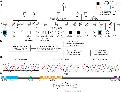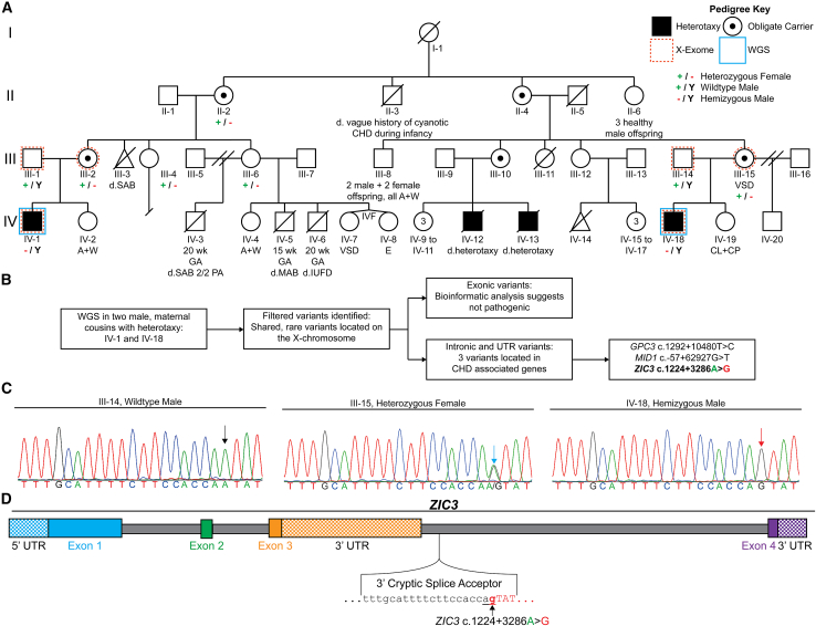 Figure 1. Intronic variant in ZIC3 identified by WGS of an X-linked heterotaxy pedigree. (A) A pedigree with four heterotaxy-affected males (black squares) displaying an X-linked recessive inheritance pattern. Generations are labeled I–IV while individuals within each generation are numbered from 1 to 20. Deceased individuals are denoted with a diagonal line with the cause of death indicated as “d.” when available. X-exome sequencing (dashed orange outer frame) performed on two separate trios did not identify a coding variant in ZIC3, while WGS (solid blue outer frame) completed on two males with heterotaxy (IV-1 and IV-18) revealed a ZIC3 c.1224+3286A>G intronic variant. A + W, alive and well; CHD, congenital heart defect; CL, cleft lip; CP, cleft palate; E, encephalocele; GA, gestational age; IUFD, intrauterine fetal demise; IVF, in vitro fertilization; MAB, missed abortion; P, pregnancy; SAB, spontaneous abortion; SAB 2/2 PA, spontaneous abortion secondary to placental abruption; VSD; ventricular septal defect; wk, week. (B) Schematic diagram of IV-1 and IV-18 WGS and variant filtering steps (Figure S1) identifying ZIC3 c.1224+3286A>G as a plausible disease-causing variant. (C) Sanger sequencing chromatogram of the predicted 3′ splice acceptor site in III-14, III-15, and IV-18. The sequence at the ZIC3 c.1224+3286 position is denoted as a black arrow for the father (ZIC3 c.1224+3286A), a red arrow for the hemizygous male with heterotaxy (ZIC3 c.1224+3286A>G), and a blue arrow for the heterozygous mother. (D) ZIC3 contains four exons with the untranslated regions (UTRs) shown as checkerboard-colored rectangles. The ZIC3 c.1224+3286A>G variant is located within the intronic region between exons 3 and 4 and it is predicted to result in a cryptic 3′ splice acceptor sequence (see also Table S6). Predicted intronic and exonic sequences are shown in lowercase and capital letters, respectively. The mutated “g” in ZIC3 c.1224+3286A>G is shown in bold red while the predicted “ag” cryptic splice acceptor caused by the variant is underlined. |