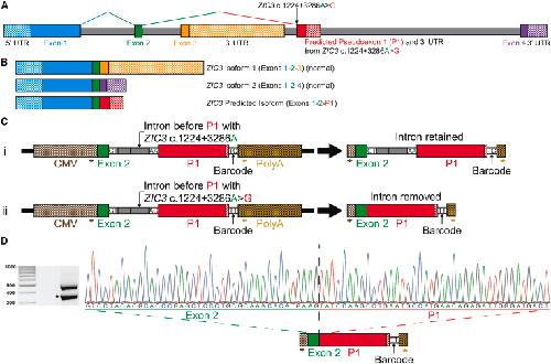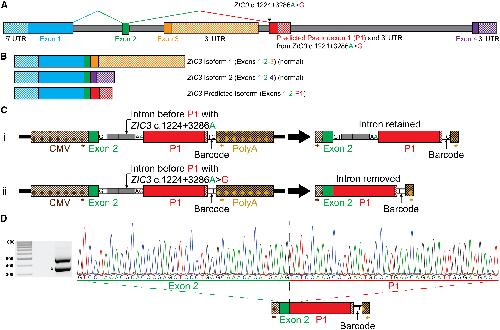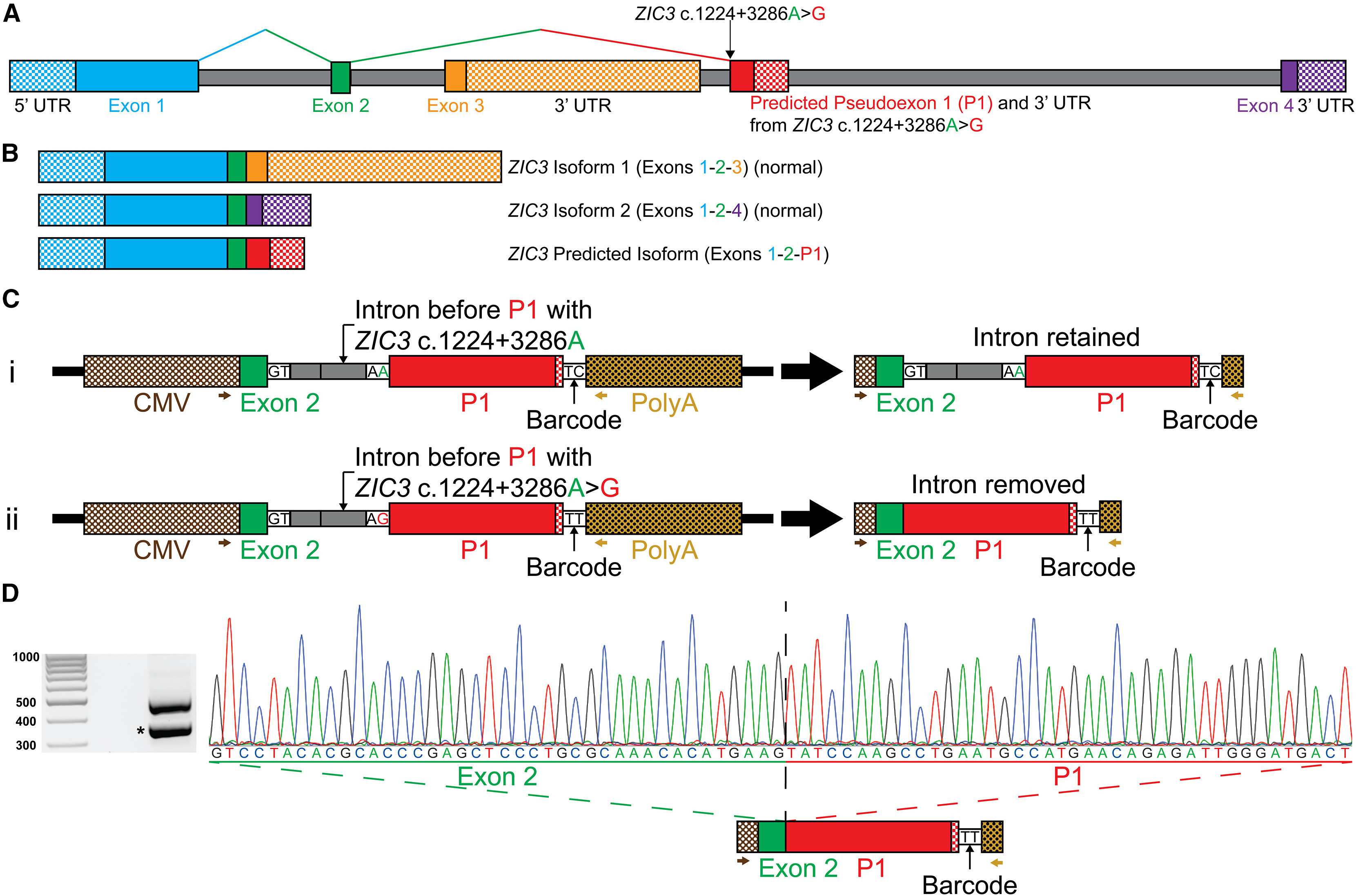 Figure 2. The ZIC3 c.1224+3286A>G variant acts as a 3′ splice acceptor between exon 2 and the predicted P1 in a minigene assay. (A) Illustrative representation of ZIC3 showing the ZIC3 c.1224+3286A>G variant predicted to result in a 3′ cryptic splice acceptor that causes the inclusion of P1. (B) ZIC3 encodes two isoforms: isoform 1 formed by exons 1-2-3 (dominant isoform), and isoform 2 encoded by exons 1-2-4. The ZIC3 predicted isoform is expected to be encoded by exons 1-2-P1. (C) Minigene plasmids contain a 1,289-bp minigene construct composed of a CMV promoter (brown and white checkerboard pattern), exon 2 (final 40-bp portion, green), intron (140 bp, gray), P1 (255 bp, predicted coding region of P1, red; predicted 3′ UTR region of P1, red and white checkerboard pattern), a 2-bp barcode sequence, and an SV40 poly(A) tail signal sequence (dark yellow and white checkerboard pattern). (Ci) The exon 2 to P1 control construct contains the reference ZIC3 c.1224+3286A sequence predicted to not alter splicing resulting in full intron retention. (Cii) The exon 2 to P1 construct containing the ZIC3 c.1224+3286A>G variant is predicted to generate a 3′ splice acceptor and remove the intron. (D) Electrophoretogram of amplicons obtained by RT-PCR from amplified cDNA of the ZIC3 c.1224+3286A>G variant construct, using primers located on the CMV promoter (brown arrow) and the SV40 poly(A) tail sequence (dark yellow arrow). The top amplicon (∼500 bp) corresponds to full intron retention, while the ∼360-bp amplicon represents intron removal. Sanger sequencing chromatogram of the ∼360-bp amplicon showing that the intronic region between exon 2 and P1 was removed. |