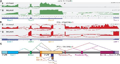 Figure 4. Unique isoforms generated by splicing events in ZIC3 AtoG_C1 cells. (A and B) Integrative Genomics Viewer image of the chromosome X range 137,566,444–137,578,187 (GRCh38/hg38) showing Sashimi plots for ZIC3 generated from short-read (Ai and Bi) and long-read (Aii and Bii) RNA-seq analysis from ZIC3 WT (green) and ZIC3 AtoG_C1 (red) cells. The junction coverage minimum was set to 20 and 10 for short and long reads, respectively. The ZIC3 c.1224+3286 genomic position is denoted with an arrow. (C) Illustrative diagram depicting splicing events caused by the ZIC3 c.1224+3286A>G variant. Exons generated by the ZIC3 c.1224+3286A>G variant are illustrated as follows: exon 3T(170) (orange, a 170-bp truncated exon 3), exon 3A(163) (gold, a 163-bp alternative exon located in the 3′ UTR of exon 3), exon 3A(227) (dark blue, a 227-bp alternative exon located in the 3′ UTR of exon 3), P1(57) (red, a 57-bp P1 where the 3′ splice acceptor is caused by the ZIC3 c.1224+3286A>G variant), P2(151) (pink, a 151-bp pseudoexon 2), and exon 4L(1792) (dark pink, a 1,792-bp longer version of exon 4). |