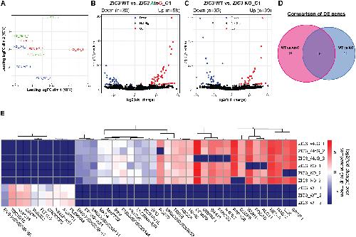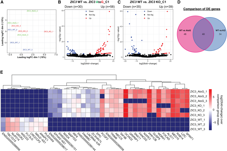 Figure 5. Differential expression analysis suggests ZIC3 AtoG_C1 and ZIC3 KO_C1 cells have similar gene profiles. (A) Multidimensional scaling plot of undifferentiated ZIC3 WT (n = 3; blue), ZIC3 AtoG_C1 (n = 3; green), and ZIC3 KO_C1 (n = 3; red) H1-OCT4-eGFP cells. Each data point represents one RNA-seq sample, while the distance between any two samples corresponds to the leading logFC (base 2 logarithm of fold change, the average of the largest absolute logFC). (B and C) Volcano plots of DE genes between (B) undifferentiated ZIC3 WT vs. ZIC3 AtoG_C1 cells and (C) undifferentiated ZIC3 WT vs. ZIC3 KO_C1 cells. Blue and red dots denote downregulated and upregulated genes, respectively. An FDR-adjusted p-value cutoff of 0.01 was used to denote DE genes and the total numbers of downregulated and upregulated genes are shown. (D) Venn diagram of the total number of DE genes between each comparison. (E) Heatmap of the 40 genes that were DE in both ZIC3 AtoG_C1 cells and ZIC3 KO_C1 cells relative to ZIC3 WT cells. |