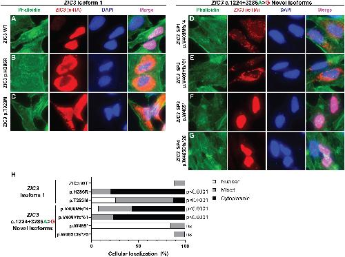 Figure 6. Cellular localization of ZIC3 isoforms. (A–G) Representative images of HeLa cells transfected with HA-tagged ZIC3 plasmids encoding either (A) WT, (B and C) previously published single-nucleotide variants (p.H286R and p.T323M), or (D–G) the coding sequence of ZIC3 isoforms generated by the ZIC3 c.1224+3286A>G variant. Cells were incubated with phalloidin (cytoplasmic marker, green), a rabbit α-HA tag (anti-HA, red), and DAPI (nuclear marker, blue). Merged images display nuclear localization of the HA-tagged ZIC3 isoforms in light purple color. (H) The cellular localization was classified as either nuclear (white), cytoplasmic (black), or mixed (gray, both nuclear and cytoplasmic) and the results are presented as percentages. Transfections were performed in n = 3 separate experiments and at least 100 cells were imaged for each transfection each time. Images were randomized and deidentified for unbiased scoring and statistical analysis was conducted using a Kruskal-Wallis test followed by a Dunn’s test for multiple comparisons. ns, not significant. |