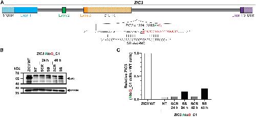 Figure 9. ZIC3 is partially rescued in ZIC3 AtoG_C1 cells by splicing blocking vivo-morpholino (MO)(A) Schematic diagram showing the splice-blocking (SB) vivo-MO sequence and mRNA-binding site overlapping the 3′ splice acceptor generated by the ZIC3 c.1224+3286A>G variant. The mutated “g” is shown in bold red, while the “ag” cryptic splice acceptor caused by the variant is underlined.(B) Immunoblotting image of ZIC3 (∼55 kDa) detected in cell lysates from ZIC3 WT and ZIC3 AtoG_C1 cells. ZIC3 AtoG_C1 cells received either no treatment (NT), SB vivo-MO, or a scramble (SCR) vivo-MO for 24 or 48 h. Based on sequence homology, the bands at ∼60–65 and ∼45 kDa might correspond to ZIC2 and ZIC4, respectively. GAPDH served as loading control.(C) Relative levels of ZIC3 from ZIC3 AtoG_C1 cells that received NT (light gray), an SCR vivo-MO (dark gray), or an SB vivo-MO (black) for either 24 or 48 h. compared to ZIC3 from ZIC3 WT cells (white bar). Levels of ZIC3 were normalized to their respective GAPDH levels from n = 1 experiment. |