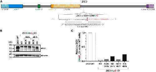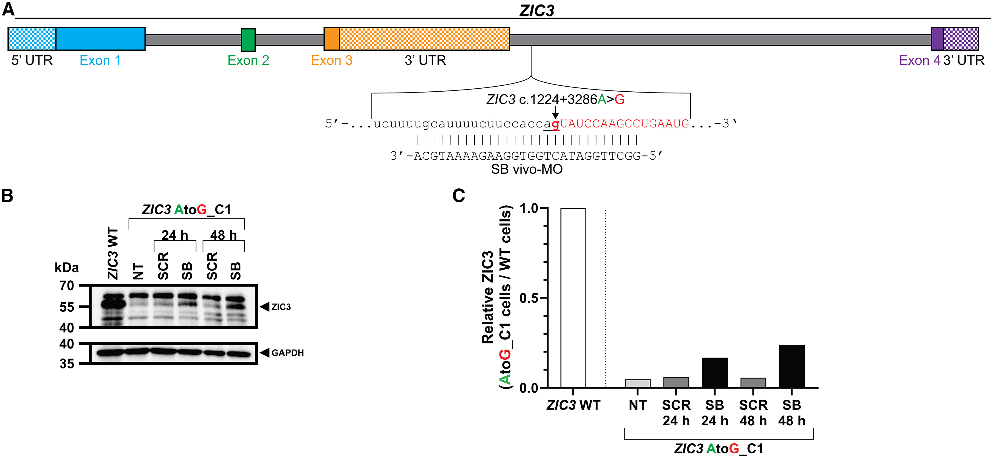 Figure 9. ZIC3 is partially rescued in ZIC3 AtoG_C1 cells by splicing blocking vivo-morpholino (MO). (A) Schematic diagram showing the splice-blocking (SB) vivo-MO sequence and mRNA-binding site overlapping the 3′ splice acceptor generated by the ZIC3 c.1224+3286A>G variant. The mutated “g” is shown in bold red, while the “ag” cryptic splice acceptor caused by the variant is underlined. (B) Immunoblotting image of ZIC3 (∼55 kDa) detected in cell lysates from ZIC3 WT and ZIC3 AtoG_C1 cells. ZIC3 AtoG_C1 cells received either no treatment (NT), SB vivo-MO, or a scramble (SCR) vivo-MO for 24 or 48 h. Based on sequence homology, the bands at ∼60–65 and ∼45 kDa might correspond to ZIC2 and ZIC4, respectively. GAPDH served as loading control. (C) Relative levels of ZIC3 from ZIC3 AtoG_C1 cells that received NT (light gray), an SCR vivo-MO (dark gray), or an SB vivo-MO (black) for either 24 or 48 h. compared to ZIC3 from ZIC3 WT cells (white bar). Levels of ZIC3 were normalized to their respective GAPDH levels from n = 1 experiment. |