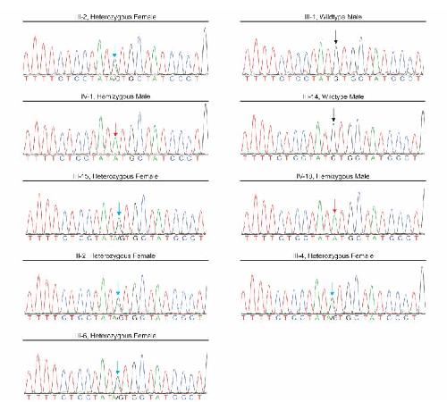 Figure S3. Sanger sequencing results near the GPR101 c.1225 locus. Sanger sequencing chromatograms for all individuals with DNA available: III-2, III-1, IV-1, III14, III-15, IV-18, II-2, III-4, and III-6. The sequence of the GPR101 c.1225 position is denoted as a black arrow for wildtype males (GPR101 c.1225G), a red arrow for hemizygous males (GPR101 c.1225G>A), and a blue arrow for heterozygous females. |
