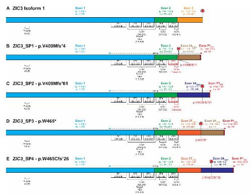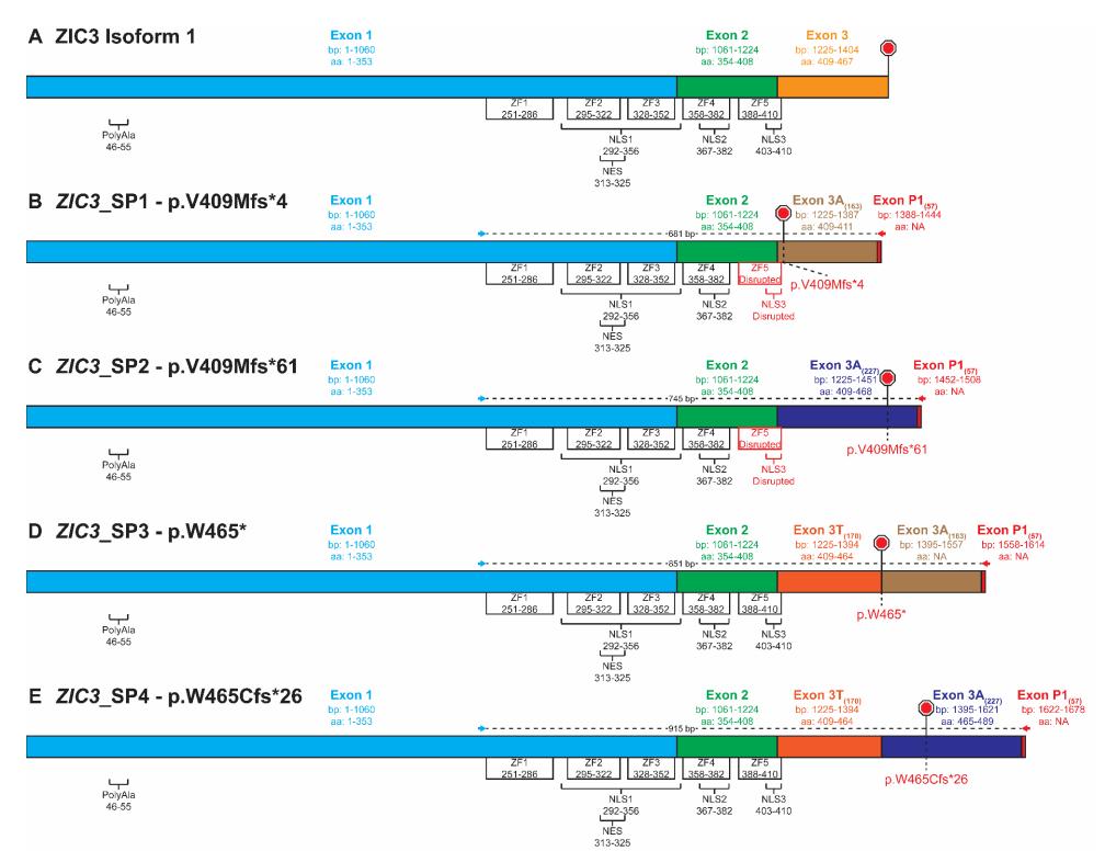 Figure S8. Illustration of the abnormal isoforms caused by the ZIC3 c.1224+3286A>G intronic variant detected in genetically modified H1-OCT4-eGFP cells. Comparison of (A) ZIC3 isoform 1 (NM_003413.4, NP_003404.1) with (B-E) the four abnormal ZIC3 isoforms (ZIC3_SP1 - ZIC3_SP4) generated by the ZIC3 c.1224+3286A>G intronic variant. The nucleotide (bp) and corresponding amino acid (aa) sequence range are provided for each exon. Stop sign symbol denotes the stop codon location for each isoform. Forward and reverse primers binding sites are shown by light blue and red arrows, respectively. (A) ZIC3 isoform 1 is encoded by 3 exons and contains a polyalanine tract (PolyAla), five zinc finger (ZF) DNA binding domains, three nuclear localization signals (NLS), and a nuclear export signal (NES) sequence. (B) ZIC3_SP1 is encoded by exons 1, 2, 3A(163) (gold), and P1(57) (red) while (C) ZIC3_SP2 is encoded by exons 1, 2, 3A(227) (dark blue), and P1(57). (B-C) ZIC3_SP1 and ZIC3_SP2 by-pass the normal coding sequence of exon 3, and therefore have disrupted ZF5 and NLS3 domains. (D) ZIC3_SP3 is encoded by exons 1, 2, 3T(170) (orange), 3A(163), and P1(57). E) ZIC3_SP4 is encoded by exons 1, 2, 3T(170), 3A(227), and P1(57). (D-E) Given that exon 3T(170) is a truncated version of exon 3, all known functional domains are intact for ZIC3_SP3 and ZIC3_SP4. NA, not applicable. |