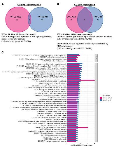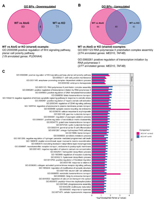 Figure S9. Gene Ontology (GO) analysis suggests undifferentiated ZIC3 AtoG_C1 and ZIC3 KO_C1 cells are similar.(A-B) Venn diagrams of the total number of GO biological processes (BPs) that were (A) downregulated or (B) upregulated in undifferentiated H1-OCT4-eGFP ZIC3 mutant (ZIC3 AtoG_C1 or ZIC3 KO_C1) cells relative to ZIC3 WT cells. Example GO BPs shared between ZIC3 AtoG_C1 and ZIC3 KO_C1 cells are listed along with the number and names of the annotated genes within those GO BPs. (C) Bar graph showing the significance of the 4 downregulated and 40 upregulated GO BP terms shared by ZIC3 AtoG_C1 and ZIC3 KO_C1 cell lines. A p-value weight01 Fisher algorithm cutoff of 0.05 was used to denote significantly different BPs. |