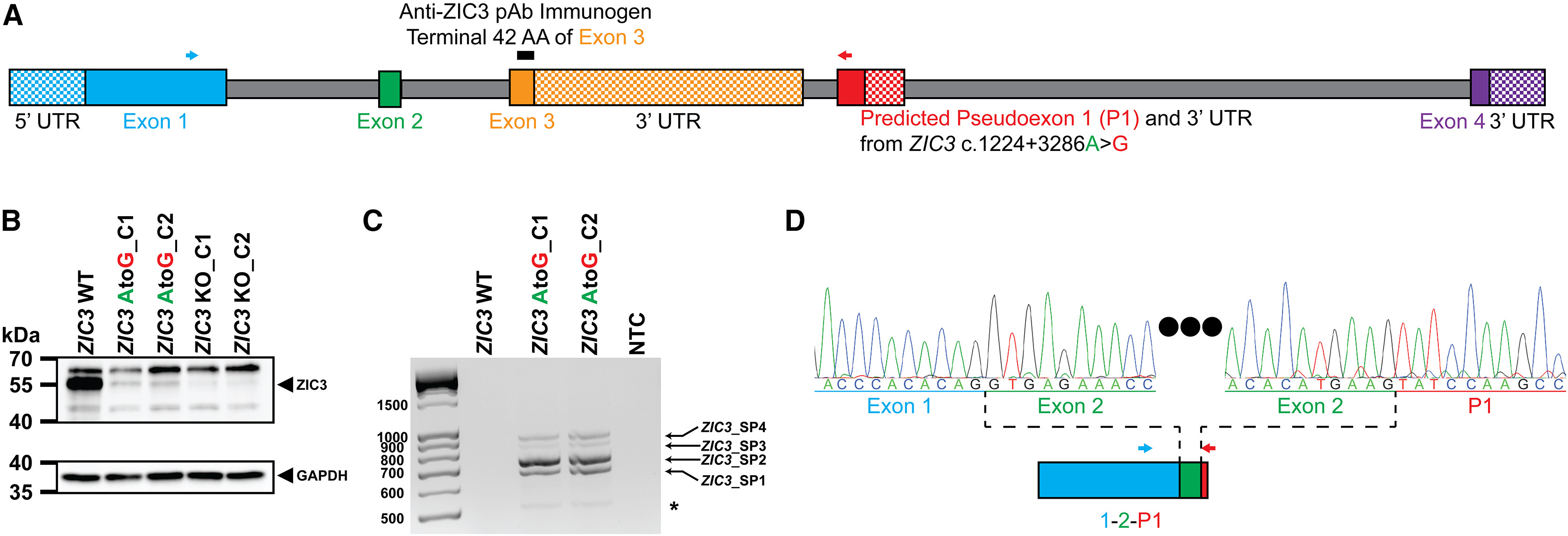 Figure 3. ZIC3 c.1224+3286A>G variant reduces level of ZIC3 isoform 1 and disrupts RNA splicing(A) Illustrative representation of ZIC3 showing the immunogen region of the ZIC3 polyclonal antibody (pAb) used in (B), which corresponds to the terminal 42 amino acids of exon 3 and the location of forward and reverse primers (blue and red arrows, respectively) used for preliminary splicing analysis in (C) and (D). AA, amino acids.(B) Immunoblotting image of ZIC3 isoform 1 (∼55 kDa) detected in cell lysates from H1-OCT4-eGFP human embryonic stem cells (hESCs). The ZIC3 c.1224+3286A>G clones (ZIC3 AtoG_C1 and C2, respectively), as well as the ZIC3 knockout clones (ZIC3 KO_C1 and C2, respectively) were generated by CRISPR-Cas9 technology. The ZIC3 WT denotes non-edited H1-OCT4-eGFP hESC. Based on sequence homology, the bands at ∼60–65 kDa and ∼45 kDa might correspond to ZIC2 and ZIC4, respectively. GAPDH served as loading control.(C) Electrophoretogram of amplicons obtained by RT-PCR from cDNA amplification of ZIC3 WT, ZIC3 AtoG_C1, and ZIC3 AtoG_C2 cells. Forward and reverse primers are in exon 1 and P1, respectively (blue and red arrows in A). NTC, no-template control. The asterisk denotes a 518-bp amplicon of the initially predicted ZIC3 isoform containing exons 1-2-P1. The four other amplicons correspond to the dominant splicing patterns between exon 1 and P1: ZIC3_SP1–ZIC3_SP4 (details in Figure S8).(D) Sanger sequencing chromatogram of the 518-bp putative ZIC3 isoform containing exons 1, 2, and P1. The black dots interrupting the sequence of exon 2 represent a break so that the sequences of the junctions are displayed. |