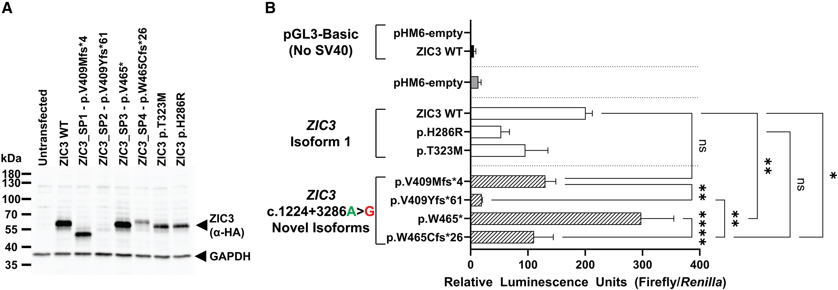 Figure 7. ZIC3 isoforms display differential expression and SV40 promoter activity. (A) Western blot image of HEK293 cells transfected with HA-tagged ZIC3 plasmids encoding ZIC3 isoform 1 (ZIC3 WT), the coding sequence of four ZIC3 isoforms generated by the ZIC3 c.1224+3286A>G variant, or two previously published ZIC3 single-nucleotide missense variants (p.T323M and p.H286R). An untransfected control was also included. HA-tagged ZIC3 was detected using an antibody against the HA tag (α-HA). GAPDH served as a loading control. (B) pGL3-SV40 firefly (SV40) luciferase reporter activity in HEK293 cells transfected with HA-tagged pHM6 plasmids encoding ZIC3 isoform 1 (WT), the two ZIC3 missense variants described above, or the coding sequence of abnormal ZIC3 isoforms. The pHM6-empty and pGL3-Basic without the SV40 promoter (no SV40) vectors served as controls. Results are presented as the mean of relative luminescence units (Firefly/Renilla) ± standard error of the mean (SEM) from n = 3 independent experiments. Statistical analysis was conducted using ANOVA followed by Tukey’s test for multiple comparisons. ∗p < 0.05; ∗∗p < 0.001; ∗∗∗∗p < 0.0001; ns, not significant. |