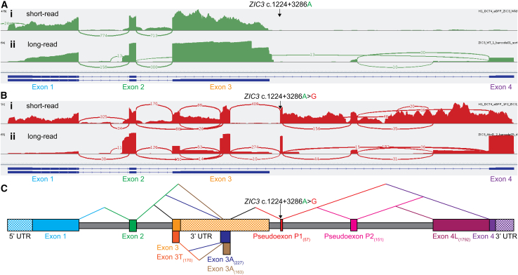 Figure 4. Unique isoforms generated by splicing events in ZIC3 AtoG_C1 cells(A and B) Integrative Genomics Viewer image of the chromosome X range 137,566,444–137,578,187 (GRCh38/hg38) showing Sashimi plots for ZIC3 generated from short-read (Ai and Bi) and long-read (Aii and Bii) RNA-seq analysis from ZIC3 WT (green) and ZIC3 AtoG_C1 (red) cells. The junction coverage minimum was set to 20 and 10 for short and long reads, respectively. The ZIC3 c.1224+3286 genomic position is denoted with an arrow.(C) Illustrative diagram depicting splicing events caused by the ZIC3 c.1224+3286A>G variant. Exons generated by the ZIC3 c.1224+3286A>G variant are illustrated as follows: exon 3T(170) (orange, a 170-bp truncated exon 3), exon 3A(163) (gold, a 163-bp alternative exon located in the 3′ UTR of exon 3), exon 3A(227) (dark blue, a 227-bp alternative exon located in the 3′ UTR of exon 3), P1(57) (red, a 57-bp P1 where the 3′ splice acceptor is caused by the ZIC3 c.1224+3286A>G variant), P2(151) (pink, a 151-bp pseudoexon 2), and exon 4L(1792) (dark pink, a 1,792-bp longer version of exon 4). |