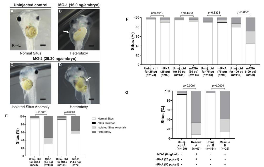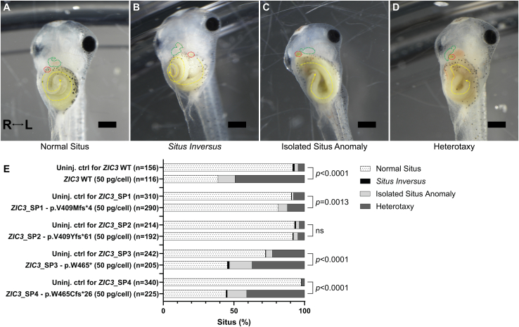 Figure 8. Situs abnormalities in X. laevis embryos injected with abnormal ZIC3 isoforms. (A–D) Representative images of X. laevis tadpoles (stage 47) that received at the two-cell stage one of the following: no injection (uninjected control [uninj. ctrl]) (E) in vitro synthesized mRNA encoding the coding sequence of HA-tagged ZIC3 isoform 1 (ZIC3 WT, 50 pg/cell; 100 pg/embryo), in vitro synthesized mRNA encoding the coding sequence of one of the four HA-tagged ZIC3 c.1224+3286A>G isoforms (50 pg/cell; 100 pg/embryo). Situs defects were assessed by the position of the heart, gallbladder, and gut and categorized into one of four groups. (A) Normal situs tadpoles display normal heart looping (green dashed line), normal right gut origin and counterclockwise gut coil (yellow dashed line), and normal position of the gallbladder on the right (red dashed line). (B) Situs inversus tadpoles exhibit reversed heart looping, left gut origin with clockwise gut coil, and leftward gallbladder. (C) Isolated situs anomaly tadpoles have one organ defect (right-origin gut coil with clockwise rotation), while (D) heterotaxy tadpoles have two or more organ defects (reversed heart looping, a left gallbladder position, and a left gut origin with counterclockwise gut coil). Scale bars, 0.5 mm. Videos are provided as Videos S5, S6, S7, and S8. The Fisher’s exact test (two sided) served to calculate significance (p < 0.05) by comparing the number of embryos with normal situs to the sum of the number of embryos with abnormal situs (situs inversus, isolated situs anomaly, and heterotaxy). Raw counts used for statistical analysis are included in Table S7. ns, not significant. |