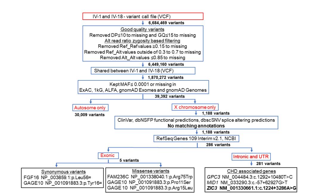 Figure S1. Whole genome sequencing variant filtering identified an intronic variant in ZIC3. Variant filtering from IV-1 and IV-18 whole genome sequencing showing the number of variants in the variant call file (VCF) after each filtering step. Good quality variants based on read depth (DP) and genotype quality (GQ) were kept and the alternative (Alt) read ratio was calculated to filter out additional poor-quality variants using zygosity based filtering (the Alt read ratio is expected to be close to 1 for homozygous alternative calls, close to 0.5 for heterozygous calls, and close to 0 for homozygous reference (Ref) calls). Variants shared between both individuals were retained followed by variants with a minor allele frequency (MAF) ≤0.0001 or missing in several reference databases [Exome Aggregation Consortium (ExAC),4 1000 Genomes Project (1kG),5 Allele Frequency Aggregator (ALFA),6Genome Aggregation Database (gnomAD) Exomes, and gnomAD Genomes7 ]. Variants located on the X chromosome were taken into higher consideration due to the inheritance pattern of the pedigree and these variants were not previously annotated in ClinVar,3 the database for nonsynonymous SNPs functional predictions (dbNSFP) v3.0,8 and the database for all potential human SNVs within splicing consensus regions (dbscSNV) v1.1.9 286 variants were located within the National Center for Biotechnology Information (NCBI) list of reference sequence (RefSeq) genes of which 5 variants were in exonic regions of FAM236C, FGF16, and GAGE10. The exonic variants do not explain the heterotaxy phenotype. Manual review of the intronic and untranslated (UTR) identified variants in genes previously associated with congenital heart defects (CHDs): GPC3, MID1, and ZIC3. |