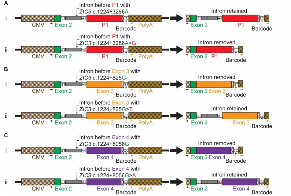 Figure S2. ZIC3 minigene splicing assay plasmid regions.(A-C) Illustration of ZIC3 minigene constructs. Each construct contains a 600 bp CMV promoter sequence (brown and white checkerboard pattern), a 435 bp minigene region containing the ZIC3 exon-intron-exon regions of interest, a unique 2 bp barcode, and a 240 bp SV40 poly(A) tail signal sequence (dark yellow and black checkerboard pattern). Primers used to assess for splicing were located on the CMV promoter (brown arrow) and the SV40 poly(A) tail sequence (dark yellow arrow). For all constructs, the 435 bp ZIC3 exon-intron-exon region of interest contains the same initial 95 bp corresponding to the final 40 bp of exon 2 (green) and 55 bp of the initial intron sequence after exon 2 (grey, canonical GT splice donor sequence denoted). The remaining 340 bp portion of each ZIC3 exon-intron-exon region of interest varies for each construct. (A) ZIC3 minigene constructs to test for the inclusion of a pseudoexon termed pseudoexon 1 (P1, red). The remaining 340 bp portion of the ZIC3 exon-intron-exon region of interest contains either 84 bp of the intron sequence immediately before the predicted P1, 1 bp of either (Ai) the ZIC3 c.1224+3286A reference sequence predicted to cause intron retention or the (Aii) ZIC3 c.1224+3286A>G variant sequence predicted to cause pseudoexon inclusion, and 255 bp of the predicted P1 sequence immediately after the ZIC3 c.1224+3286 region (predicted coding region of P1, red, predicted 3’ UTR region of P1, red and white checkerboard pattern). (B-C) Additional control and test constructs were designed in a similar manner to assess for splicing between ZIC3 (B) 2nd and 3rd exons as well as (C) the 2nd and 4th exons. (B) ZIC3 minigene constructs to test for normal splicing between exons 2 and 3 (yellow). The remaining 340 bp portion of the ZIC3 exon-intron-exon region of interest contains either 84 bp of the intron sequence immediately before exon 3 (grey), 1 bp of either (Bi) the ZIC3 c.1224+825G reference sequence predicted to have normal splicing between exons 2 and 3 or (Bii) ZIC3 c.1224+825G>T test sequence predicted to cause intron retention, and 255 bp of the exon 3 immediately after the ZIC3 c.1224+825 region (coding sequence of exon 3, yellow, 3’ UTR region of exon 3, yellow and white checkerboard pattern). (C) ZIC3 minigene constructs to test for normal splicing between exon 2 and exon 4 (purple). The remaining 340 bp portion of the ZIC3 exon-intron-exon region of interest contains either 84 bp of the intron sequence immediately before exon 4 (grey), 1 bp of either (Ci) the ZIC3 c.1224+8056G reference sequence predicted to have normal splicing between exons 2 and 4 or (Bii) ZIC3 c.1224+8056G>A test sequence predicted to cause intron retention, and 255 bp of the exon 4 immediately after the ZIC3 c.1224+8056 region (coding sequence of exon 4, purple, 3’ UTR region of exon 4, purple and white checkerboard pattern). Full-length sequences are provided in Excel File S1, and plasmid maps are available upon request. |