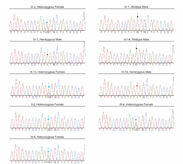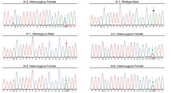 Figure S7. Sanger sequencing results near the ZIC3 c.1224+3286 locus for additional family members. Sanger sequencing chromatograms displaying the predicted 3’ cryptic splice acceptor site in III-2, III-1, IV-1, II-2, III-4, and III-6. The sequence at the ZIC3 c.1224+3286 position is denoted as a black arrow for the wildtype male (ZIC3 c.1224+3286A), a red arrow for the hemizygous male (ZIC3 c.1224+3286A>G), and a blue arrow for heterozygous females. |
