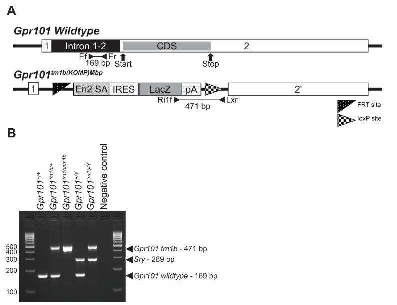 Figure S5. Confirmation of the Gpr101tm1b(KOMP)Mbp allele. (A) Gpr101 is an X-linked gene containing two exons. Exon 2 contains the entire coding sequence (CDS) of the wildtype allele. The Ef and Er primers produce a 169 bp amplicon corresponding to the wildtype Gpr101 allele. The Gpr101tm1b(KOMP)Mbp allele retains the first exon as well as a large segment of the 3’ UTR of the second exon (showed as 2’) but lacks the entire CDS of Gpr101 within exon 2 and instead contains a LacZ cassette. Ri1f and Lxr primers generate a 471 bp amplicon specific to the Gpr101 tm1b allele. (B) Using the primers described above as well as primers for the Sry, the mouse line was successfully genotyped. A non-template sample served as a negative control. En2 SA, mouse homeobox protein engrailed-2 splice acceptor; FRT site, flippase recognition target site; IRES, internal ribosome entry site; LacZ, β-galactosidase reporter gene; loxP site, Locus of X-over P1 site; pA, SV40 polyadenylation sequence; Sry, sex determining region of the Y chromosome. |