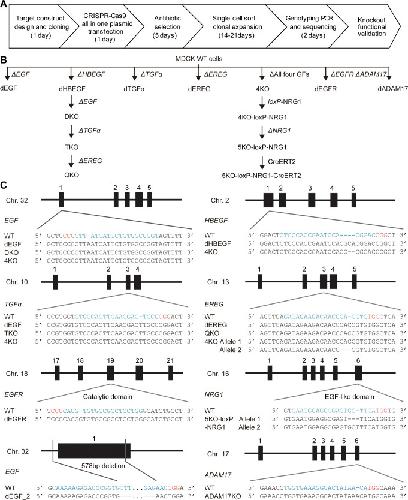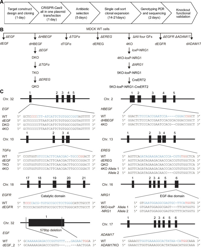 Figure S2. Generation of gene knockouts.(A) Workflow for generation of gene knockouts in MDCK cell lines. (B) Phylogenetic tree of the MDCK cells used in this study. (C) Mutations of the targeted genes in the MDCK cell lines. Black rectangles depict exons. The gRNA and PAM sequences are depicted in blue and red, respectively. |