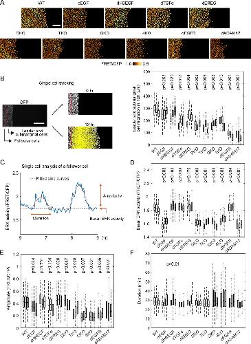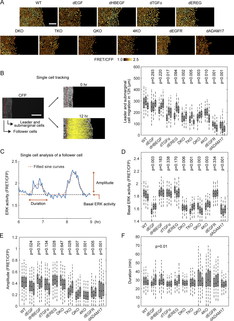 Figure 2. Single-cell analyses of ERK activation dynamics in MDCK cells deficient of epidermal growth factor receptor ligands.MDCK cells expressing EKARrEV were subjected to confinement release assay. (A) Time-lapse images of FRET/CFP ratio were acquired every 2 min for up to 12 h to generate Video 1. Shown are snapshots cropped from the Video. Scale bar, 100 μm. (B) We defined the cells locating within 100 μm from the edge of the open space as the leader and submarginal cells, the others as follower cells. CFP channel images were binarized for single cell detection. From the track of the leader and submarginal cells, migration distance in 12 h was measured (left). Scale bar, 200 μm. Boxplot of leader and submarginal cell migration in 12 h observation (right). The total number of analyzed cells from three independent experiments is as follows: WT, 395, 167, and 298 cells; dEGF, 386, 408, and 178 cells; dHBEGF, 447, 370, and 478 cells; dTGFα, 408, 366, and 388 cells; dEREG, 505, 525, and 504 cells; DKO, 256, 233, and 304 cells; TKO, 197, 270, and 229 cells; QKO, 278, 463, and 441 cells; 4KO, 407, 233, and 154 cells; dEGFR, 584, 303, and 217 cells; dADAM17, 254, 183, and 205 cells. (C) After applying a mask for nuclei of the follower cells, the time course of FRET/CFP ratio in each cell was analyzed from six to 9 h after the start of migration (blue line). The ratio values were fitted by sine curves for the detection of waves (red line). (D, E, F) For each wave, basal ERK activity (D), amplitude (E) and duration (F) were determined. The numbers of analyzed cells are as follows: WT, 814, 801, and 990 cells; dEGF, 789, 596, and 789 cells; dHBEGF, 846, 617, and 683 cells; dTGFα, 808, 762, and 838 cells; dEREG, 762, 1,030, and 953 cells; DKO, 638, 656, and 560 cells; TKO, 649, 778, and 567 cells; QKO, 507, 638, and 567 cells; 4KO, 681, 291, and 451 cells; dEGFR, 643, 493, and 684 cells; dADAM17, 346, 498, and 318 cells. (B, D, E, F)