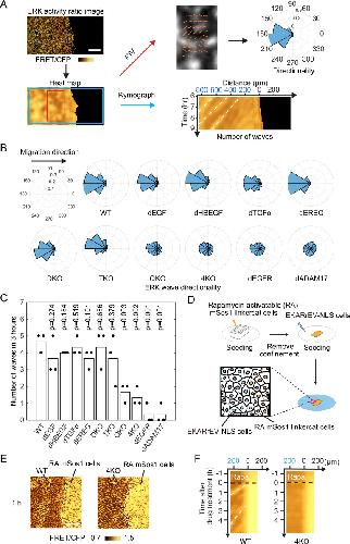 Figure 3. Propagation of ERK activation waves from leader cells.(A) Heat maps of ERK activity were obtained by interpolating the signals between the nuclei of cells and used for particle image velocimetry and kymograph analysis. Directionality was measured by particle image velocimetry and shown with polar histogram. Kymograph was obtained by interpolated ratio image. White broken lines indicate representative ERK waves. Scale bar, 200 μm. (B) The direction of ERK activation wave from six to 9 h after releasing of silicone confinement was shown by Polar histograms. Shown are summation of three independent experiments. (C) During the period of 6–9 h after the release of silicone confinement, the number of ERK activation waves from the leader cells was manually counted on the kymograph. Each dot represents the number of counted ERK activation waves in an independent experiment. P-values of two-tailed t test (WT to the others) are shown on the top. (D, E, F) For the artificial generation of ERK activation waves, MDCK cells expressing EKARrEV and rapamycin-activable mSos1 was seeded in a silicone confinement. (D) MDCK cells expressing EKARrEV alone were seeded in the surrounding area (D). Upon rapamycin addition, ERK activation waves were generated at the border of cell lines. (E) Time-lapse FRET/CFP ratio images were acquired to generate Video 2. Shown are representative FRET/CFP ratio images 1 h after addition of rapamycin. White broken lines indicate the border of cell lines. Scale bar, 50 μm. (F) Kymographs of ERK activity in MDCK-WT and MDCK-4KO cells upon rapamycin addition. White broken lines indicate representative ERK waves. |
