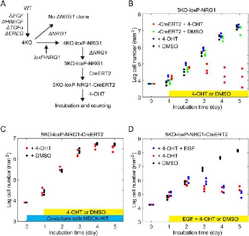 Figure 5. Growth arrest of cells deficient from all epidermal growth factor receptor ligands.(A) Schematics of experiment to obtain 5KO cell line. The MDCK-4KO cells expressing EKARrEV biosensor were transfected stably with an expression vector for loxP-NRG1- loxP named as 4KO-loxP-NRG1. Then 5KO-loxP-NRG1 was generated by knocking out endogenous NRG1. Followed by integrating CreERT2, 5KO-loxP-NRG1-CreERT2 was treated with 4-OHT to obtain 5KO cell line. (B) The growth rate represented on a log (cell number) basis. Cell numbers was measured over 5 d post-seeding of 5KO-loxP-NRG1 cell line with addition of 4-OHT (blue dots) or DMSO (black dots) and 5KO-loxP-NRG1-CreERT2 cell line with addition of 4-OHT (red dots) or DMSO (green dots) at day one. Each dot represents cell number in an independent experiment. (B, C) 5KO-loxP-NRG1-CreERT2 cells were co-cultured with equal number of MDCK-WT cells and analyzed as in (B). (B, D) 5KO-loxP-NRG1-CreERT2 cells was analyzed as in (B) except that epidermal growth factor was exogenously added with 4-OHT. |