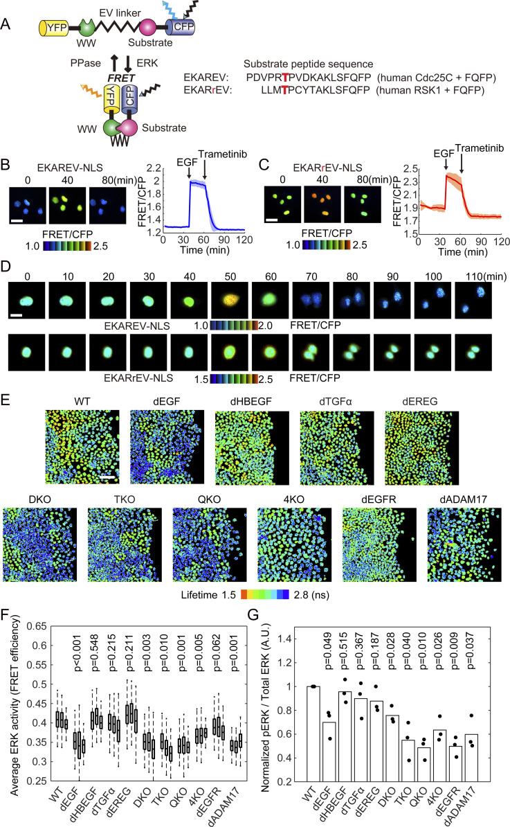 Figure 1. Properties of EKARrEV-NLS biosensor and ERK activity of MDCK cell lines after knockout of epidermal growth factor receptor ligand genes.(A) Mode of action of the intramolecular FRET biosensors for ERK, EKAREV, and EKARrEV. The red character T indicates the phosphorylation site. (B, C) MDCK cells expressing EKAREV-NLS (B) or EKARrEV-NLS (C) were observed under a wide-field fluorescence microscope to acquired FRET/CFP time-lapse images. During imaging, 10 ng mL-1−1 epidermal growth factor and 200 nM trametinib were added. Representative ratio images are shown in the IMD mode. Line plots show time courses of the FRET/CFP ratio for four cells from a single experiment. Solid lines represent the means; shaded areas represent SD. Scale bar, 40 μm. (D) MDCK cells expressing EKAREV-NLS (top) or EKARrEV-NLS (bottom) were imaged during mitosis, shown in the IMD mode. Scale bar, 20 μm. (E) Lifetime images of the donor fluorescence was acquired by a confocal microscope equipped with a 440 nm ps pulsed diode laser. MDCK cells are WT, single gene knockout (dEGF, dHBEGF, dTGFα, and dEREG), EGF/HBEGF double knockout (DKO), EGF/HBEGF/TGFα triple knockout (TKO), EGF/HBEGF/TGFα/EREG quadruple knockout (QKO and 4KO), EGFR knockout (dEGFR), and ADAM17 knockout (dADAM17). (F) Cells are time-lapse imaged every 10 min for 100 min. FRET efficiency of randomly chosen cells was plotted for each cell line. The total number of analyzed cells from two independent experiments is as follows: WT, 271, 231, and 201 cells; dEGF, 250, 255, and 171 cells; dHBEGF, 260, 136, and 206 cells; dTGFα, 227, 163, and 204 cells; dEREG, 236, 155, and 213 cells; DKO, 311, 241, and 293 cells; TKO, 253, 229, and 189 cells; QKO, 263, 232, and 186 cells; 4KO, 252, 255, and 179 cells; dEGFR, 217, 155, and 153 cells; dADAM17, 146, 140, and 198 cells. (G) 9 h after the removal of silicone confinement, MDCK cells were analyzed by immunoblotting with anti–phospho-ERK or anti–pan-ERK antibody. The phospho-ERK signal normalized to the pan-ERK signal is shown. Data from three independent experiments are shown. (F, G)