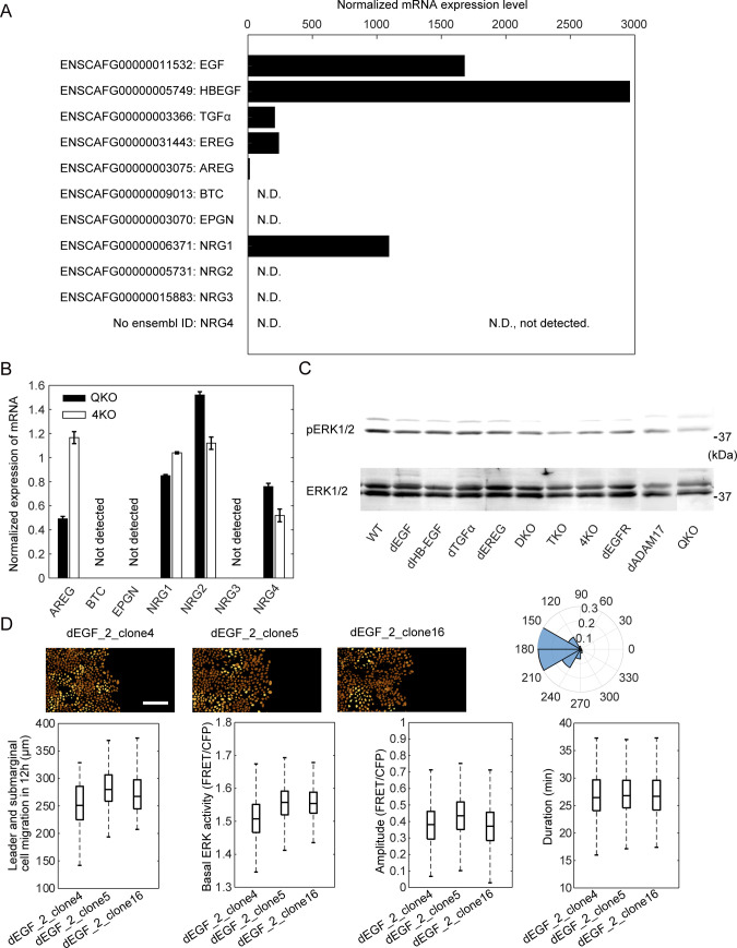 Figure S1. mRNA expression level of epidermal growth factor receptor ligands in MDCK cells.(A) Normalized mRNA expression level of epidermal growth factor receptor ligands in MDCK cells calculated from RNA-Seq data (Shukla et al, 2015). N.D., not detected. (B) Bar chart showing the mRNA level of growth factors in QKO or 4KO cells from qPCR by normalizing expression of each gene in MDCK-WT cells. (C) One of the three sets of the immunoblot image used to prepare Fig 1G. (D) Three clones of MDCK cells with the same 587-bp-nucleotide deletion in the first exon of the epidermal growth factor gene were subjected to confinement release assay and analyzed as described in the legend to Figs 2 and 3. Scale bar, 100 μm. The total numbers of analyzed cells for the polar histogram are from three independent experiments: dEGF_2_clone4, 237 cells; dEGF_2_clone5, 228 cells; dEGF_2_clone4, 276 cells. For the box plots of basal ERK activity, amplitude and duration, the following numbers of cells are analyzed: dEGF_2_clone4, 548 cells; dEGF_2_clone5, 567 cells; dEGF_2_clone4, 492 cells. |
