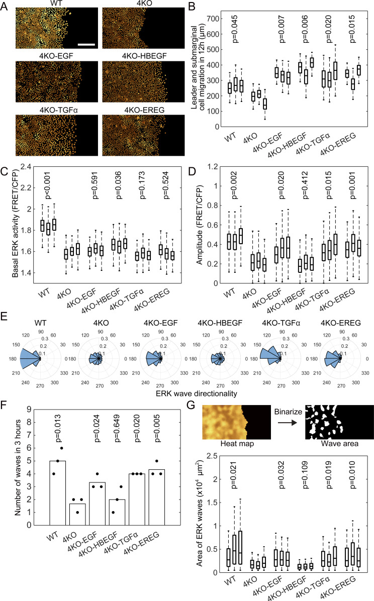Figure 4. Restoration of ERK activation waves by expression of epidermal growth factor receptor ligands in 4KO cells.The MDCK-4KO cells expressing the EKARrEV biosensor were transfected stably with an expression vector for cDNA of canine EGF, HBEGF, TGFα, or EREG; the resulting cell lines were named as 4KO-EGF, 4KO-HBEGF, 4KO-TGFα, and 4KO-EREG, respectively. WT, 4KO and epidermal growth factor receptor ligands expressing 4KO cells were subjected to confinement release assay. Three independent experiments were performed for each cell line. (A) Time-lapse FRET/CFP ratio images were acquired to generate Video 3. Shown are snapshots cropped from the Video. Scale bar, 200 μm. (B) Boxplot of leader and submarginal cell migration in 12 h observation. The number of analyzed cells from three independent experiments is as follows: WT, 357, 215, and 283 cells; 4KO, 348, 274, and 328 cells; 4KO-EGF, 130, 426, and 420 cells; 4KO-HBEGF, 224, 360, and 368 cells; 4KO-TGFα, 192, 300, and 215 cells; 4KO-EREG, 112, 404, and 373 cells. Data of three independent experiments are shown. (C, D) Box plots of basal ERK activity (C) and amplitude (D) of ERK activation in each cell line from six to 9 h after releasing of silicone confinement. The numbers of analyzed cells are as follows: WT, 703, 945, and 653 cells; 4KO, 656, 446, and 556 cells; 4KO-EGF, 576, 697, and 732 cells; 4KO-HBEGF, 667, 596, and 556 cells; 4KO-TGFα, 452, 638, and 484 cells; 4KO-EREG, 757, 786, and 902 cells. Data of three independent experiments are shown. (E) Polar histograms showing the distribution of ERK wave direction from 6–9 h after releasing of silicone confinement. Shown are summation of three independent experiments. (F) During the period of 6–9 h after the release of silicone confinement, the number of ERK activation waves from the leader cells was counted. Each dot represents the number of counted ERK activation waves in an independent experiment. (G) Wave area was measured after binarizing the denoised interpolated ratio image (upper). Box plots of the ERK wave area in each cell line at each frame from 6–9 h after releasing of silicone confinement. Data of three independent experiments are shown. (B, C, D, F, G)