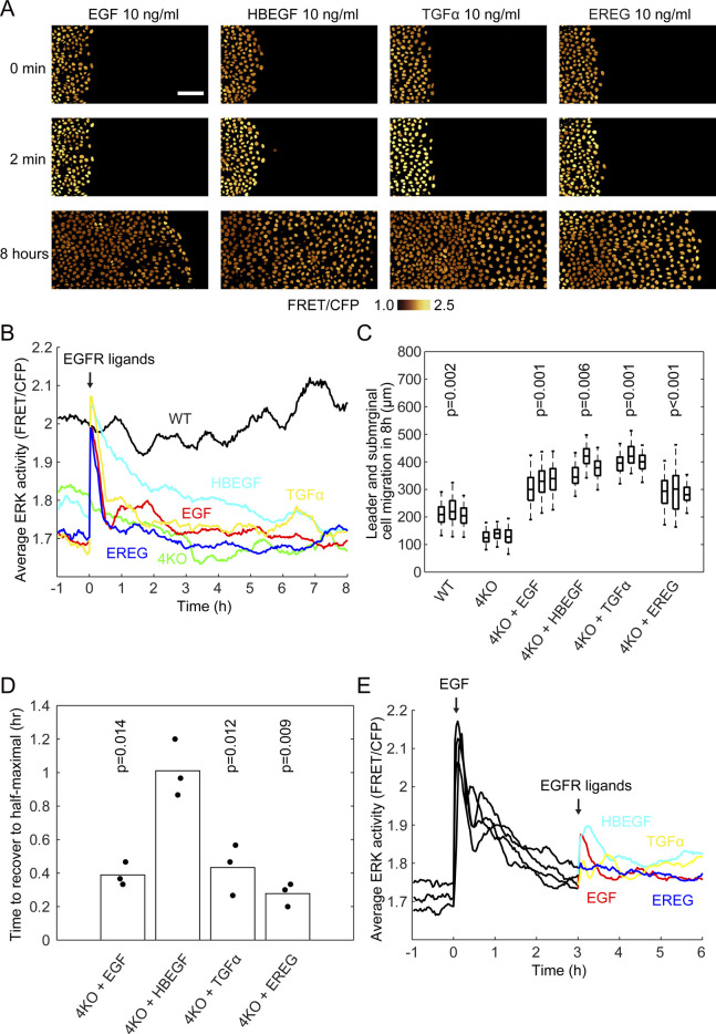 Figure S3. Restoration of migration by addition of epidermal growth factor receptor (EGFR) ligands in 4KO cells.(A) 4KO cells were subjected to confinement release assay as described in the legend to Fig 1. Images of CFP and FRET channels were acquired every 2 min for 12 h (Videos 4). Shown are snapshots before, just and 8 h after the addition of 10 ng ml−1 recombinant EGFR ligands. Scale bar, 100 μm. (B) Time course of the average FRET/CFP ratio. At time 0, 10 ng ml−1 recombinant human EGF (red), HBEGF (light blue), TGFα (yellow), and EREG (blue) were added to 4KO cell lines. WT (black) and 4KO (green) are controls without any EGFR ligands. (C) Leader cell migration in 8 h after the addition of EGFR ligands or after the release of silicone confinement (WT and 4KO). The numbers of analyzed cells are as follows: WT, 357, 215, and 283 cells; 4KO, 348, 274, and 328 cells; 4KO + EGF, 154, 128, and 193 cells; 4KO + HBEGF, 160, 253, and 235 cells; 4KO + TGFα, 301, 274, and 213 cells; 4KO + EREG, 236, 219, and 86 cells. Data of three independent experiments are shown. P-values of two-tailed t test (4KO to others) are shown in the panel. (D) Time to the half-maximal activity after the addition of EGFR ligands. Data of three independent experiments are shown. P-values of two-tailed t test (4KO + HBEGF to others) are shown in the panel. (E) Time course of the average FRET/CFP ratio. At time 0, 10 ng ml−1 recombinant human epidermal growth factor were added to 4KO cell lines, then at time 3 h, 10 ng ml−1 recombinant human epidermal growth factor (red), HBEGF (light blue), TGFα (yellow), and EREG (blue) were added to 4KO cell lines. |