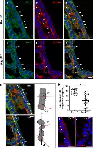 SHF progenitors, the basolateral domain is marked by Scribble (B, arrows), and the apical domain is marked by aPKCζ (A, arrowheads). The SHF progenitors have a distinct cuboidal shape, forming an organized epithelial layer (C). Polarity is disrupted in Rac1