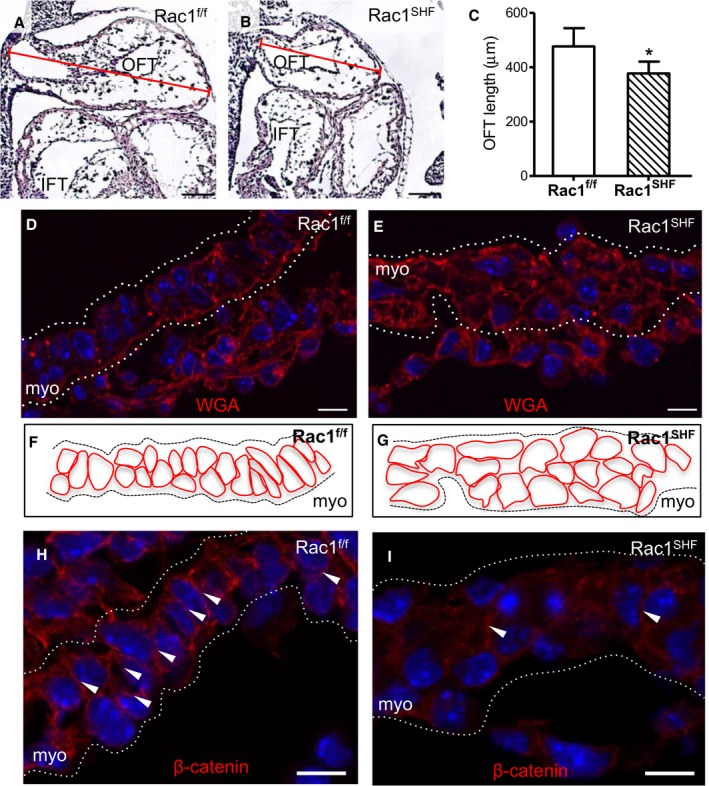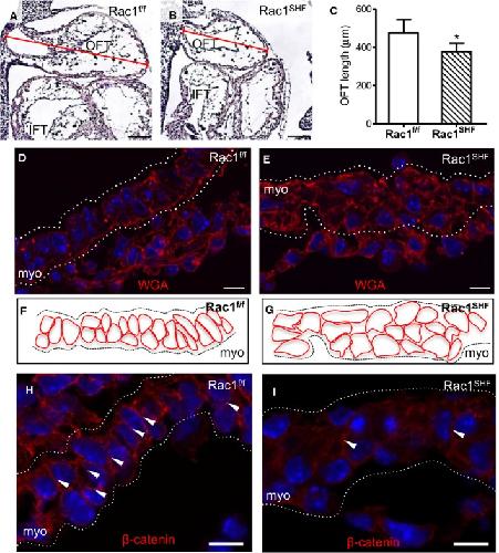 f/f) embryos. D and E, WGA staining to mark cell membranes of SHF cells in the OFT at E10.5 show a disorganized myocardial layer in Rac1