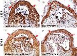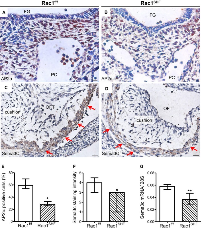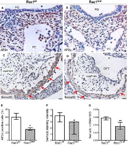 SHF hearts. A and B, AP2α immunostaining was performed to mark neural crest cells in the pharyngeal region of embryonic day 10.5 (E10.5) samples. C and D, Sema3c immunostaining (brown color) in Rac1