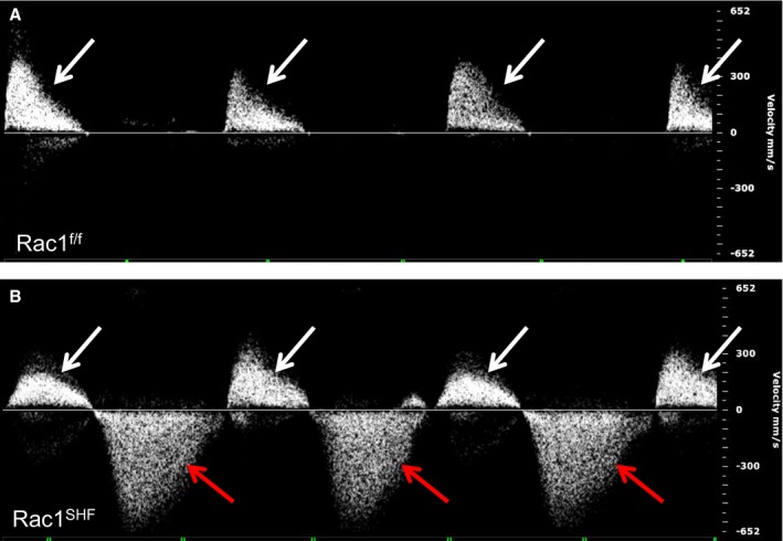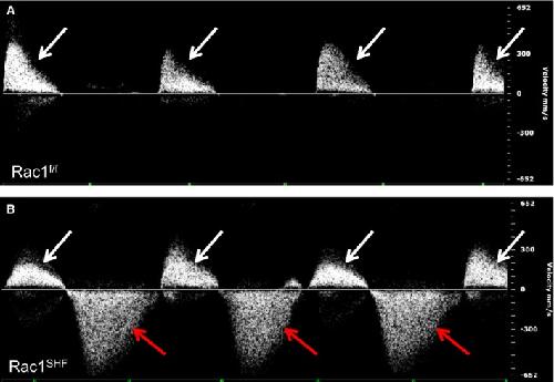 SHF hearts had severe aortic regurgitation during diastole (B, red arrows), which is not observed in Rac1