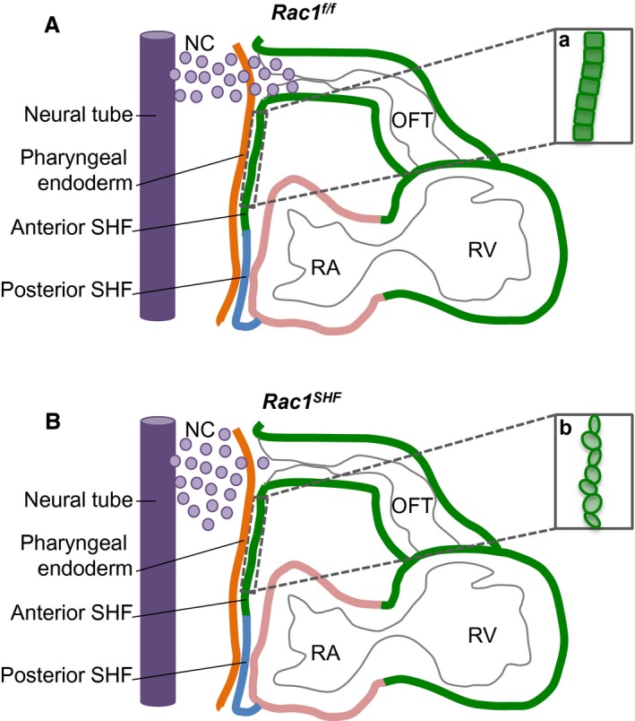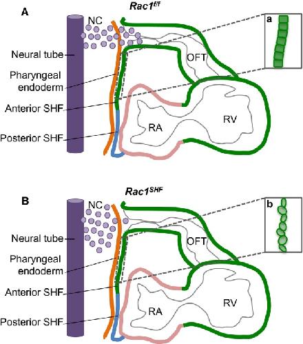 f/f anterior SHF progenitors in the splanchnic mesoderm are organized into a polarized epithelium (a). Chemotactic signals, such as semaphorin 3c, secreted by the OFT myocardium act as axonal guidance cues for migration of cardiac NC cells from the neural tube (A). In Rac1