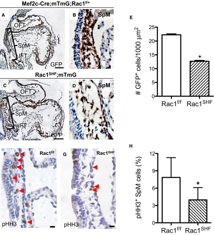 f/f) embryos. Scale bars: 100 μm (A and C), 10 μm (B and D), 20 μm (F and G). *P<0.05 by Mann–Whitney test. GFP indicates green fluorescent protein; IFT, inflow tract; OFT, outflow tract; pHH3, phosphohistone H3; SHF, second heart field; SpM, splanchnic mesoderm. |