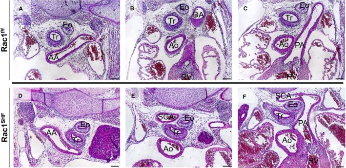 SHF hearts compared with controls (C). Scale bars: 100 μm. AA indicates aortic arch; Ao, aorta; DA, dorsal aorta; Eo, esophagus; PA, pulmonary artery; SCA, subclavian artery; Tr, trachea. |