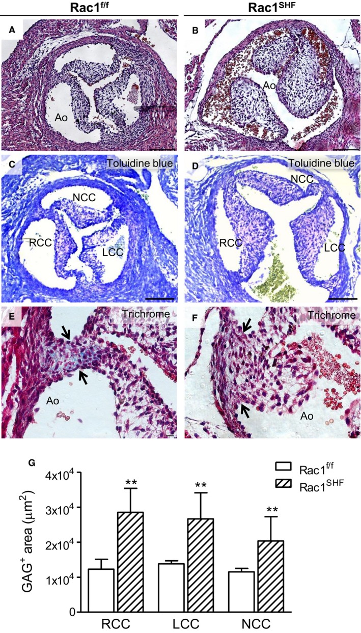 SHF hearts exhibited thick aortic valve leaflets (B) compared with the thin, remodeled valves of controls (A). Toluidine blue staining showed that GAG (light purple color) occupies the acellular space of Rac1