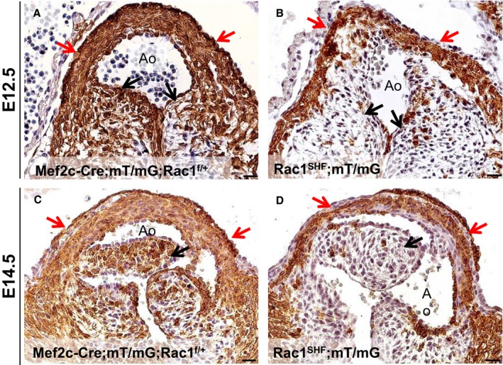 SHF hearts compared with controls (black arrows, A through D). Paraffin sections were immunostained with anti‐GFP. Scale bars: 20 μm. n=3 for each time point per group. Ao indicates aorta; E, embryonic day; OFT, outflow tract; SHF, second heart field. |