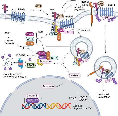 Progression of colon cancer from normal crypt to dysregulated signaling. This figure illustrates the progression from a normal intestinal crypt to colorectal cancer (CRC), highlighting the crucial role of APC (adenomatous polyposis coli) mutations in approximately 85% of colon cancer cases. In a normal crypt, a balance of signaling gradients, including BMP, TGF-β, and Wnt, maintain intestinal stem cell functionality and healthy tissue architecture. APC mutations disrupt this equilibrium. Initially, the loss of APC function leads to benign polyps characterized by epithelial dysplasia. As CRC progresses to invasive colon cancer, it typically involves a series of mutations, such as a single activating K-Ras mutation, a homozygous loss of the tumor suppressor Smad4/DPC4 (Deleted in Pancreatic Carcinoma 4), and mutations in both copies p53 genes, amounting to seven mutations on average before malignancy.79-82 These mutations, alongside disruptions in normal signaling gradients, transform normal cells into cancer-associated fibroblasts (CAFs) and colon cancer stem cells, leading to a dysregulated signaling environment conducive to tumor growth. The figure also delineates the rise in Wnt signaling and subsequent decrease in BMP signaling, contributing to increased cancer stemness in the tumor microenvironment. Some CRC cases developed without prior polyposis and are caused by mutations in DNA mismatch repair genes.79, 81-83 Even in these CRC cases, the Wnt pathway is frequently activated, whether through mutations in Axin1, Axin2, RNF43, or ZNRF3, overexpression of R-Spondin 2 or 3, or mutations that stabilize β-catenin (Figure created with BioRender.com, accessed on 11 July 2023). |