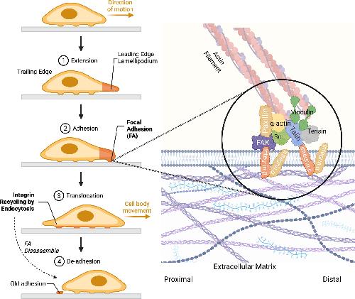 Dynamics of integrin-mediated cell-extracellular matrix adhesions and cell migration. This figure delineates the process of integrin-mediated cell adhesion to the extracellular matrix (ECM) and subsequent cell migration, which is crucial for various physiological processes and plays a significant role in cancer metastasis. Focal adhesions (FA), which link the cytoskeleton with the extracellular matrix, are orchestrated through the integrin receptor, mediating bidirectional signaling (detailed in the Zoomed-in panel). The assembly and disassembly of focal adhesions (a key aspect in integrin trafficking) are critical in effective cell migration. As shown in steps 1 to 4 (left panel), cells develop a polarized phenotype and then disassemble FA at the rear position, propelling the cell body forward and forming new adhesion points at the leading edge, coordinating the turnover and creation of adhesions during migration (Figure created with BioRender.com, accessed on 11 July 2023). |