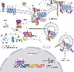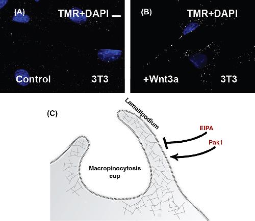Wnt treatment triggers macropinocytosis. (A) The gold standard method to study macropinocytosis is dextran of above 200 nm in diameter. Therefore, the high molecular weight marker tetramethylrhodamine (TMR)-dextran TMR 70 K was tested after Wnt3a protein (100 ng/mL from Peprotech) treatment after 20 min (B), resulting in an increase in the uptake of macropinocytosis. (C) Diagram of macropinocytosis is an actin cytoskeleton-based phenomenon driven by the activation of p21-activated kinase-1 (Pak1) that involves large endocytic vesicles (diameter over 0.2 μm). Its inhibition by amiloride derivatives such as EIPA constitutes the modern method for macropinocytosis. EIPA, ethylisopropyl amiloride. |