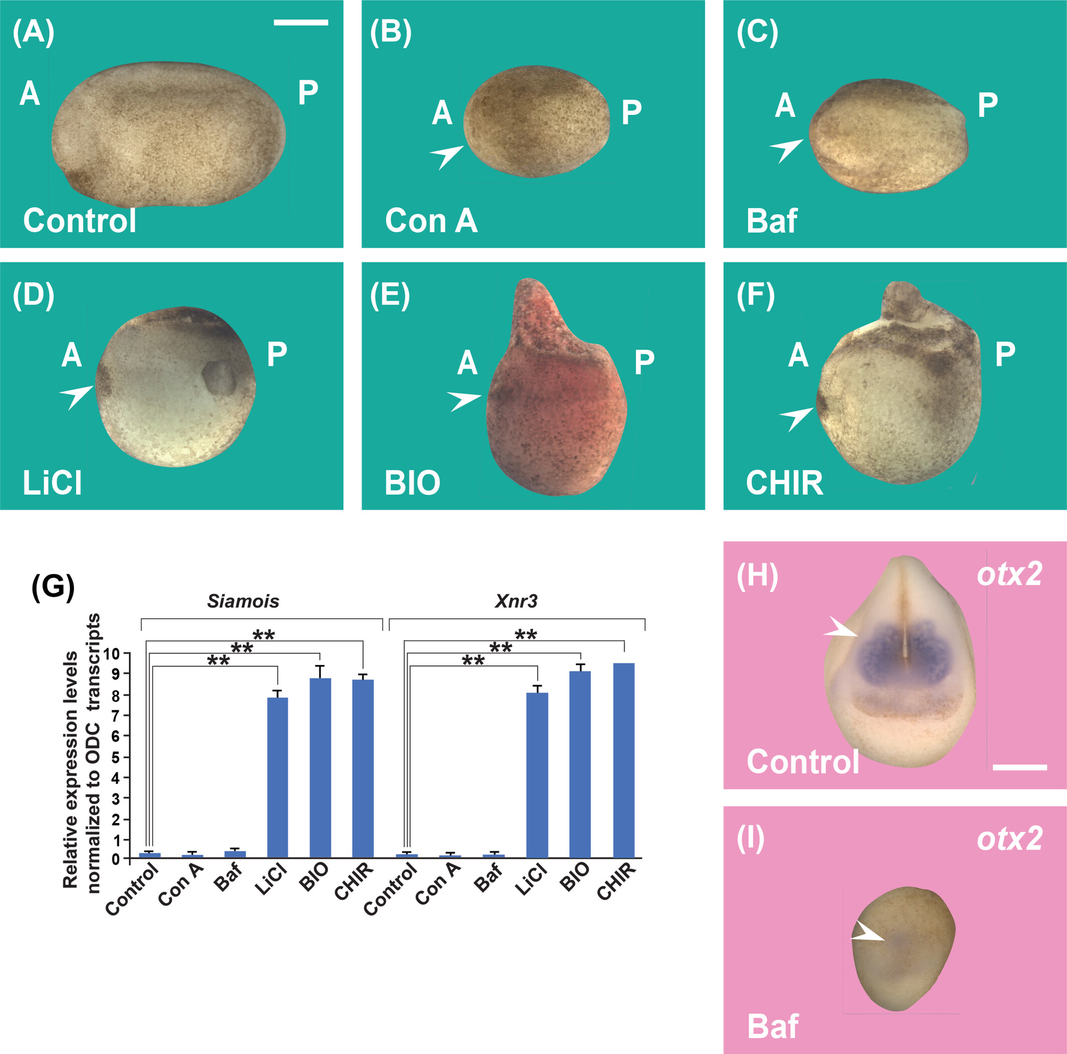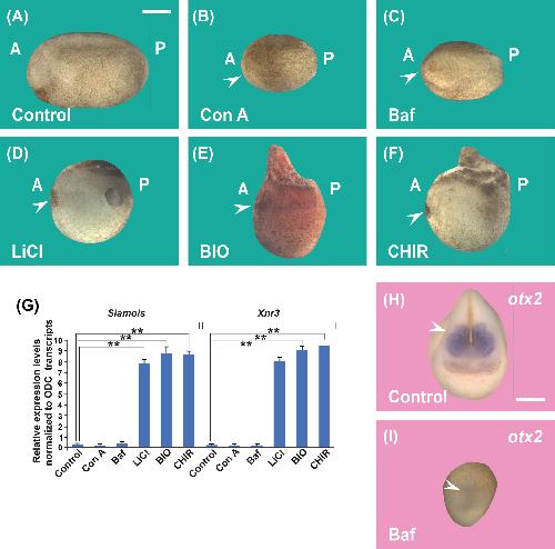There are different ways to activate Wnt signaling, one of them is through GSK3 inhibition by treatment with LiCl or BIO, or CHIR which mimics Wnt signaling. Incubating the Xenopus embryos at the 32-cell stage with the GSK3 inhibitor LiCl (300 mM, panel D) for 7 min or 6-bromoindirubin-3′-oxime (BIO, 30 mM, panel E) and then removing at stage 9.5 and further cultured to the tadpole stage in 0.1 MMR solution, or overnight treatment with CHIR99021 (CHIR, panel F), has very potent phenotypic effects by increasing the early Wnt signal, resulting in an expansion of dorsal-anterior tissues, with a loss of tail structures. Inhibiting V-ATPase (Con A or Baf, panel B and C) results in microcephalic embryos with increased ventral structures, compared with the control embryo in panel A. These indicate that the cell biology of lysosomes, macropinocytosis, membrane trafficking, and ESCRT machinery plays an essential role in vertebrate development and Wnt signaling. (G) The qRT-PCR of blastula stage 9.5 embryos shows that interfering with membrane trafficking with Baf or Con A decreases Wnt target genes Siamois and Xnr3 normalized for ornithine decarboxylase (ODC). An opposite effect is observed with Wnt activators such as LiCl, BIO, and CHIR. (H and I) Example of an in situ hybridization in Xenopus embryos incubated with Baf showing a reduction of the forebrain and midbrain marker otx2 (arrowhead). BIO, 6-bromoindirubin-3-oxime; ESCRT, endosomal sorting complexes required for transport; GSK3, glycogen synthase kinase 3. |