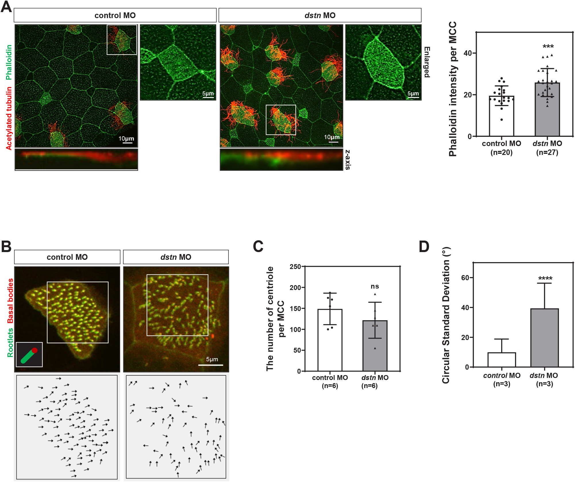 Fig. 2. Dstn is required for ciliogenesis during Xenopus embryonic development. (A) Xenopus epidermal MCCs marked by immunofluorescence using anti-acetylated tubulin (red) for cilia and phalloidin (green) for actin filament network (scale bar=10 μm; enlarged scale bar=5 μm). Statistical quantitation of phalloidin intensity revealed a significant increase in phalloidin intensity per MCC in dstn-depleted embryos as compared to control embryos. (B) Centrin-RFP and Clamp-GFP exhibited perturbation of basal body polarity in dstn-depleted embryos compared with coordinated polarity and alignment in control embryos. It is highlighted by black arrows (scale bar=5 μm). (C) We have quantified the number of centrioles per MCC in Xenopus epidermis and data showed that dstn knockdown did not significantly affect the number of centrioles in dstn morphant embryos. (D) The polarization was analyzed by angular measurements of Centrin/Clamp pairs in MCCs. Statistical analysis of data showed that dstn inhibition increased the circular standard deviation compared with control embryos (n=3). * p<0.05, ** p<0.01, *** p<0.001, **** p<0.0001, MO, morpholino oligonucleotides; MCC, multiciliated cells.