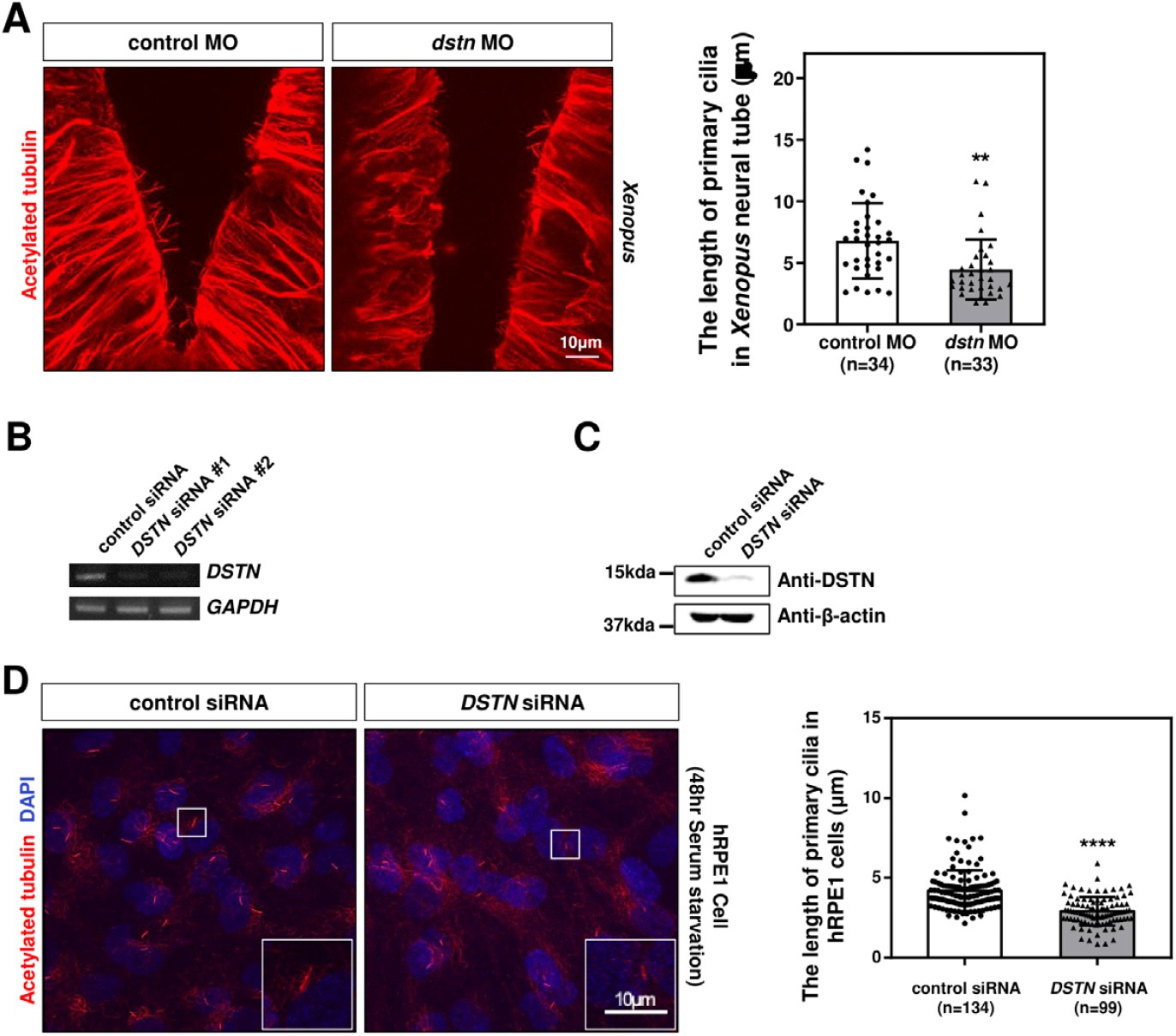 Fig. 3. Loss of Dstn results in length reduction of primary cilia in Xenopus and hRPE1 cells. (A) Acetylated tubulin immunostaining of dstn-deficient embryos revealed a considerable reduction in the length of neural tube primary cilia of Xenopus compared with control embryos (scale bar=10 μm). Statistical analysis showed that the dstn morphants exhibited a length of primary cilia less than 5 μm compared with approximately 8 μm long cilia in control embryos. (B) RT-PCR analysis revealed the specificity of DSTN siRNAs as the expression of DSTN was significantly reduced in RPE1 cells transfected with DSTN siRNAs. GADPH was used as the internal control. (C) Western blotting showed that the protein expression of DSTN was considerably reduced in DSTN siRNAs transfected hRPE1 cells. β-actin was used as the loading control. (D) hRPE1 cells were transfected with DSTN siRNAs and serum-starved for 48 hrs to induce ciliogenesis. As analyzed by immunostaining with acetylated tubulin, depletion of DSTN induced shorter primary cilia in hRPE1 cells with less than 2.5 μm compared with 5 μm long primary cilia in control hRPE1 cells (scale bar=10 μm). Statistical analysis of data revealed that the length of primary cilia was significantly reduced in DSTN-depleted cells as compared to the control cells. * p<0.05, ** p<0.01, *** p<0.001, **** p<0.0001.