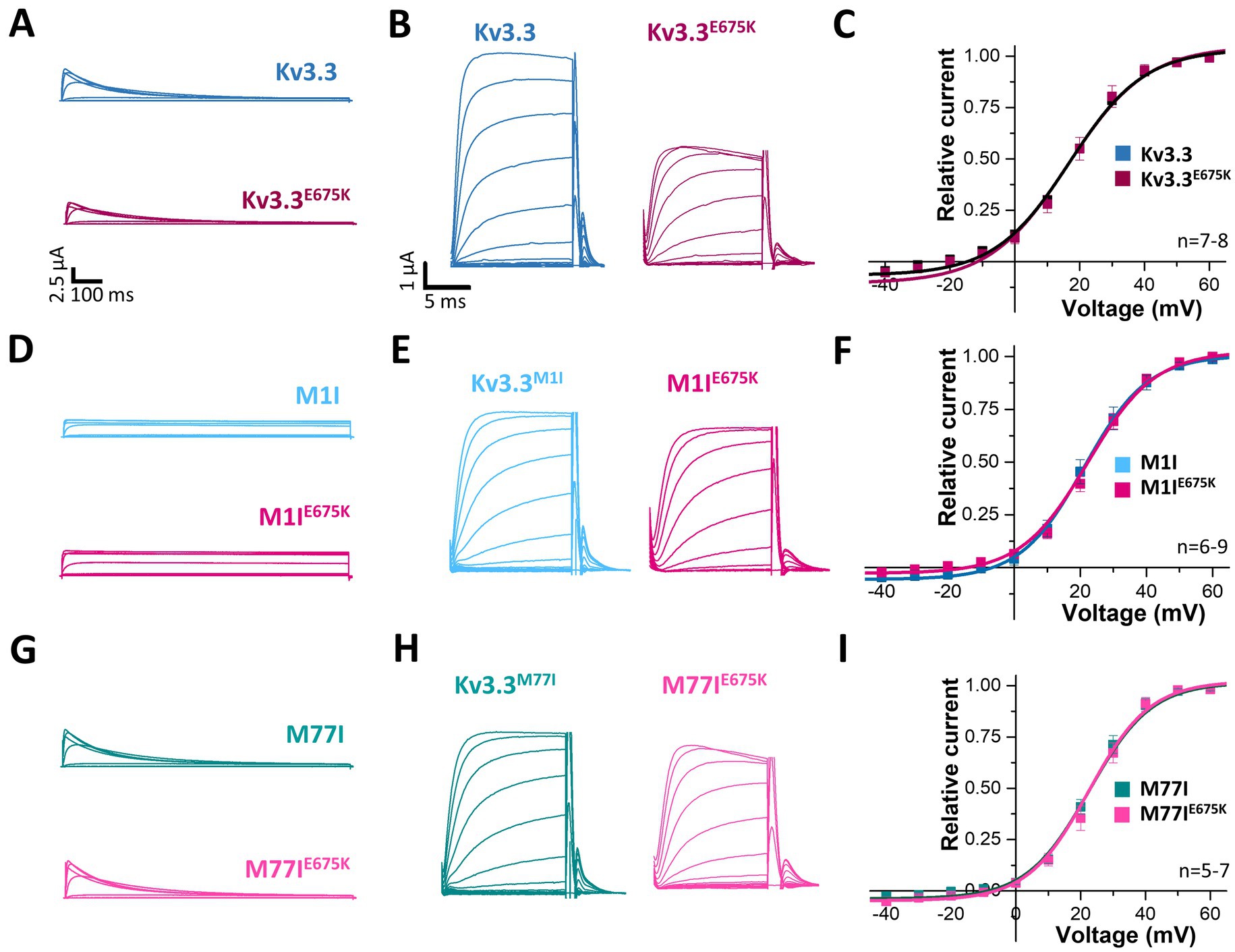 Figure 2. Voltage-dependence of activation of Kv3.3 and the Kv3.3E675K variant in different channel backgrounds. (A) Representative current traces of wild-type Kv3.3 (top) and Kv3.3E675K (bottom). The voltage protocol is illustrated in Supplementary Figure 5B. (B) Representative current traces using a short GV protocol (see Methods section and Supplementary Figure 5A) and (C) the conductance-voltage relationships derived from panel (B). (D–F) The same as in panel (A–C), but the E675K variant was studied in a forced short Kv3.3 channel (M1I mutant). (G–I) The same as in panel (A–C), but the E675K variant was studied in the in a forced long Kv3.3 channel (M77I mutant). Data are presented as mean ± s.e.m. The number of replicates is indicated within the graphs. |
