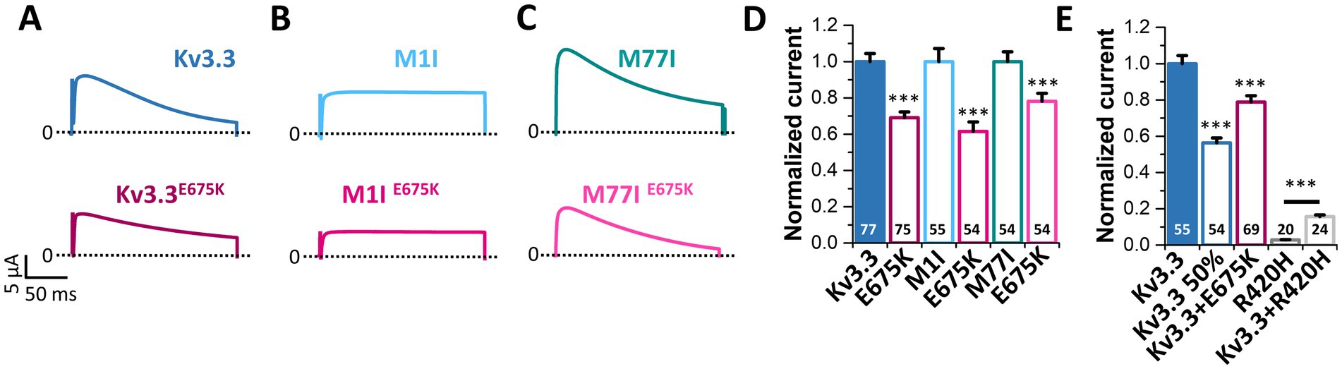 Kv3.3M1I/E675K variant. (A) Averaged current traces to illustrate the voltage-dependence of activation